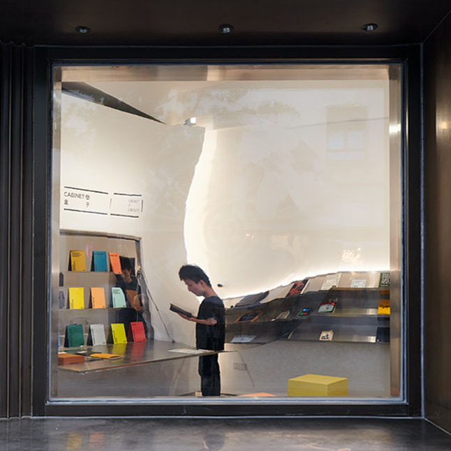 在之前的一些与周遭景物相关联的项目中,我们在关注框景的同时也在意玻璃的尺寸。如果要说比较特殊的,那就是卷宗盒子。它采用的不是严格意义上的玻璃,而是用另一种透明物——有机玻璃制作了一片凹凸透镜作为商店的橱窗,来回应“好奇物”(cabinet of curiosity)这个概念。
