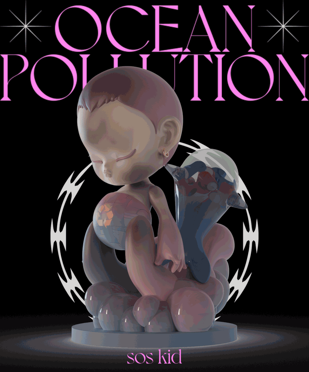 FFF:我一直认为,在艺术表达上,形式就是内容,所以外观设计就是内核故事。1万年来,我们的内核故事有发生过很大的变化吗?就像《沙丘》,在太空的背景下讲了一个中世纪的故事,因为人性的东西没有变。《千面英雄》这本书讲的也是这个道理。所以对潮玩来说,内核、理念、故事都得融入在外观设计上。比方说SOS KID海洋污染,我们特意设计了鲸鱼的尾巴,还给它一个梦幻的紫粉配色,但是你凑近一看,才发现里面装着的都是塑料,于是几乎每个人都会瞬间感受到那种美和残酷的交织,她会去联想到海洋的保护,而不是我们去说教,她只有看一段文字才能感觉得到。