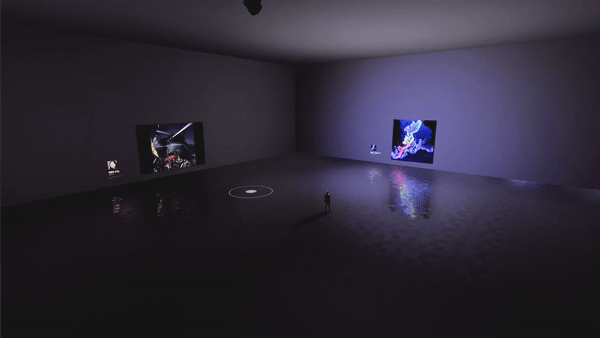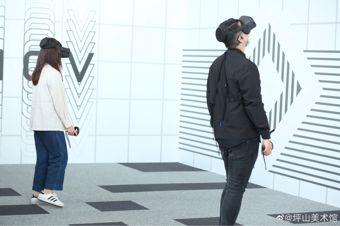 下:深圳坪山美术馆的“dslcollection”虚拟美术馆可在线下体验,观众通过佩戴VR设备便可以体验交互式虚拟艺术 / 图源:转自坪山美术馆/微博