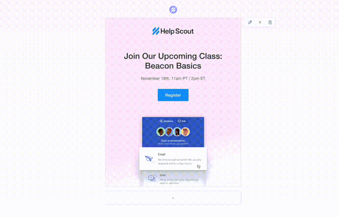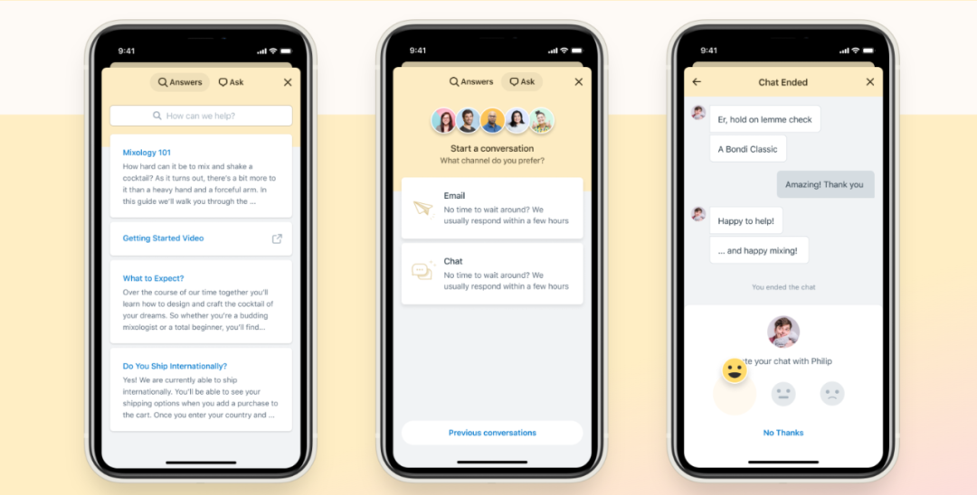 通过现有的可嵌入小部件Beacon,将聊天作为沟通渠道并带入Help Scout平台。最初的Beacon被设计为了一个超级简单的方式来查看客户网站中的帮助文档。由于这个小部件将成为聊天和未来计划的关键点,因此,Buzz推动完全使用移动优先原则重新设计了Beacon。