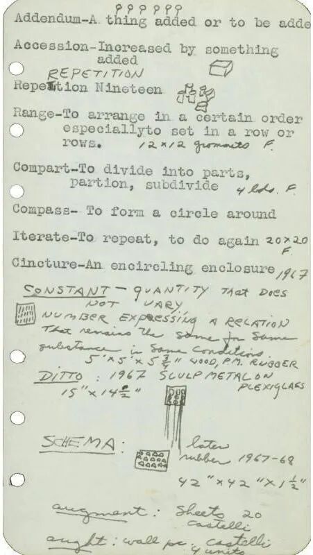 在她1967-68年的笔记本中,海瑟写道:“系列——其中每一个都与前面的相似,或与它有关,因为它是它的前辈,序列,连续,秩序,行,集,有序的连续”。在同一本笔记本中,海瑟还列出了一系列基于这些想法的标题,其中许多最终被用于其他雕塑,如1968年的《重复19 III》(Repetition 19 III, 纽约现代艺术博物馆) 和1967年的《示意图》(Schema, 费城艺术博物馆) 。大约在这个时候,博克纳给了海瑟一本词库,这成为她设计作品标题的灵感工具。在笔记本中,除了看到她的想法和定义,还包括她作品的草图,以及描绘《附录》的一系列简化的圆圈和下降线的初稿。