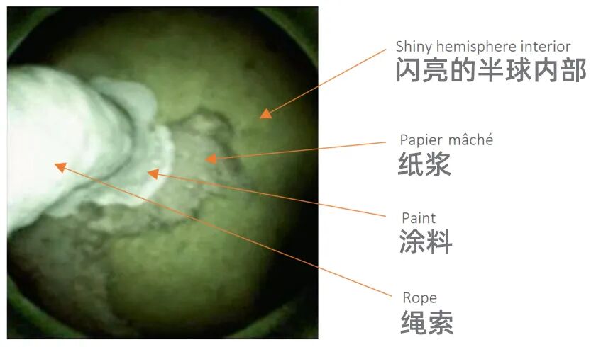 伊娃·海瑟,使用内窥镜拍摄的附录半球内部的照片,显示其闪亮的内部、穿过它的绳索,以及从绳索的孔中溢出到半球腔中的多余纸浆和油漆