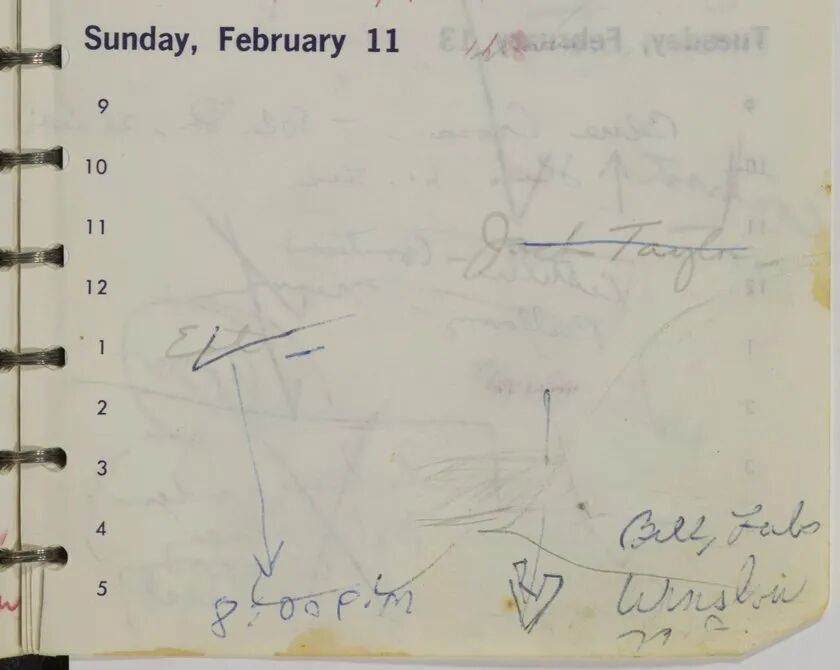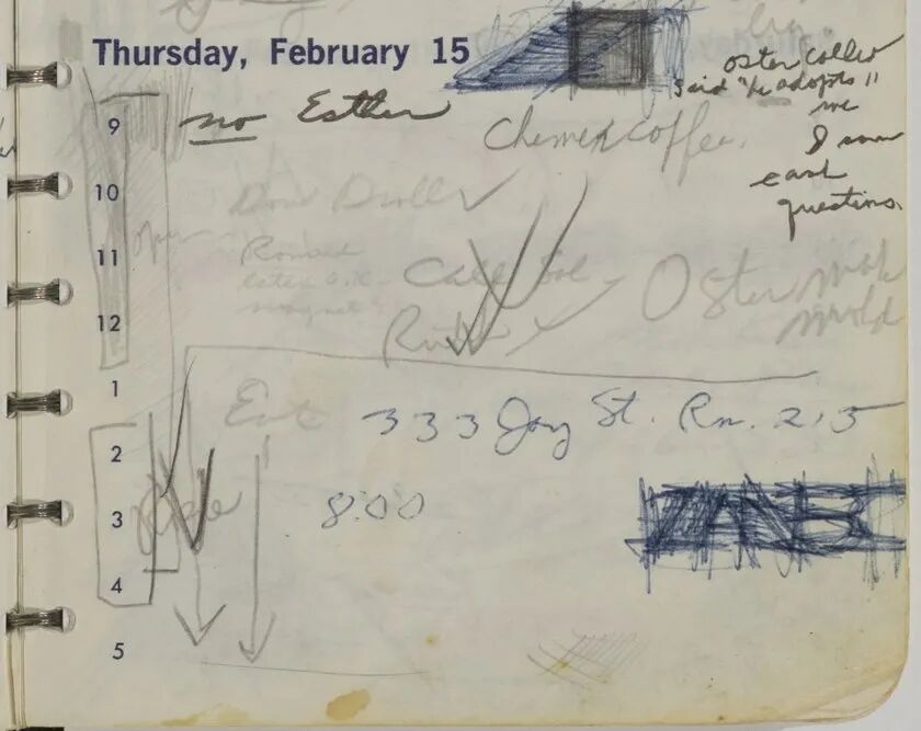 1968年2月11日的页面和书面条目,来自海瑟的约会日记,伊娃·海瑟档案馆,艾伦纪念艺术博物馆,奥柏林学院,奥柏林