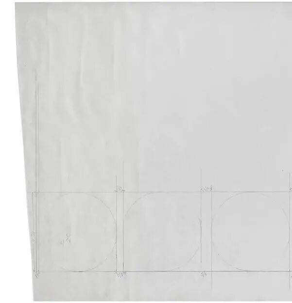 除了这些草图,海瑟还画了一张《附录》的全尺寸图纸,这很可能是她用来创作雕塑时的模板。这张先前未发表的图纸构成了康涅狄格州切斯特的勒维特收藏的一部分,包含了反映作品的间隔、半球直径和整体尺寸的详细测量和计算。在《附录》的背面,可以看到垂直的铅笔标记,表明支撑物的位置,这些都突出了为建造雕塑而绘制的图纸的技术层面。