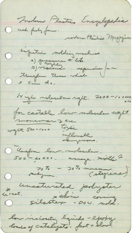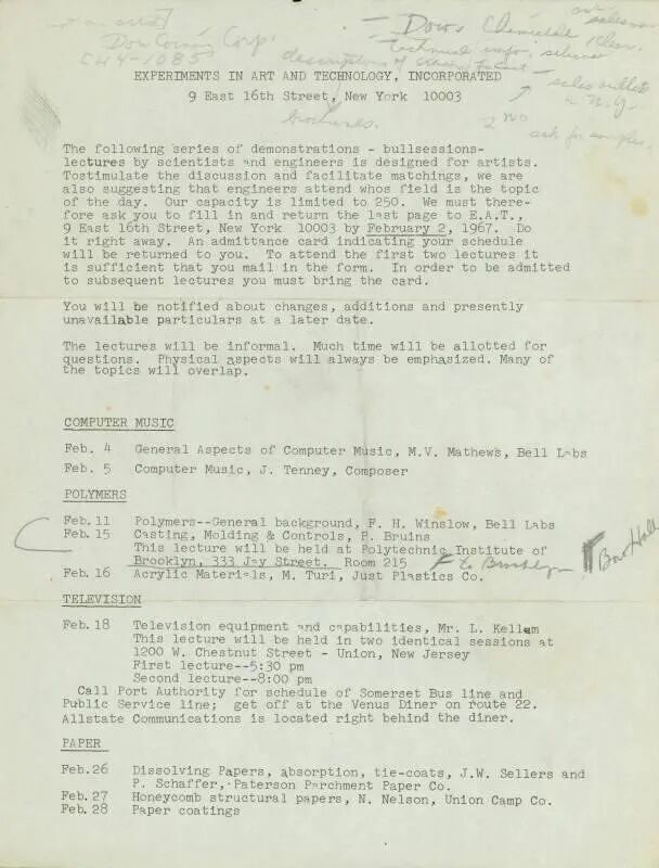 海瑟的日记显示,她参加了艺术与技术实验系列中关于“聚合物” (Polymers) 主题的两次讲座。在她1968年2月11日的日记中,写有“贝尔实验室” (Bell Labs) 和“温斯洛” (Winslow) 的字样,这与贝尔实验室的温斯洛所做的第一个聚合物讲座有关。根据计划大纲,这个讲座将向与会者介绍聚合物科学的背景,由该领域的领先专家之一进行讲解。贝尔实验室在1962年录制的温斯洛的视频提供了对这些讲座可能涉及的主题的重要见解。海瑟2月15日的日记包括 “杰伊街333号,215室”,这是在布鲁克林理工学院举办的第二次聚合物讲座 “铸造、成型和控制”的地点。在海瑟档案馆保存的艺术与技术实验计划大纲副本中,有她手写的关于如何乘坐地铁参加这次活动的说明,在页面顶部有与陶氏化学有关的说明,提醒她“要求提供样品”和“技术信息”。