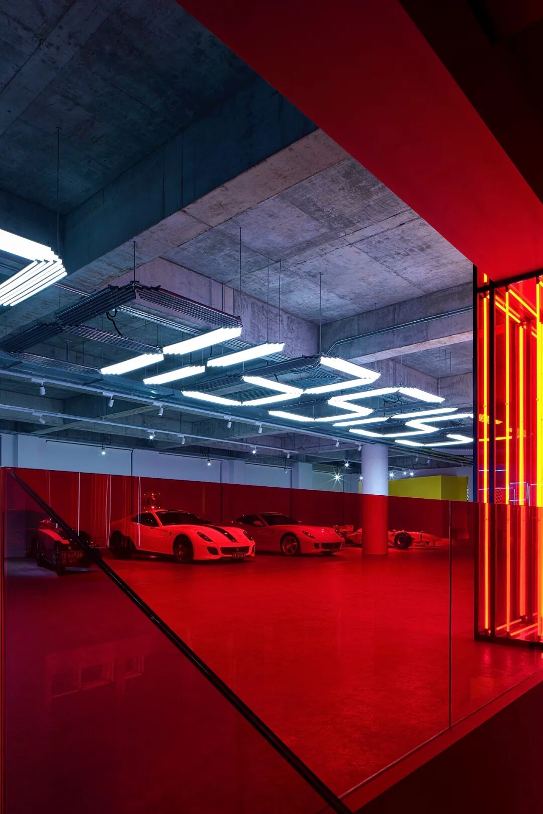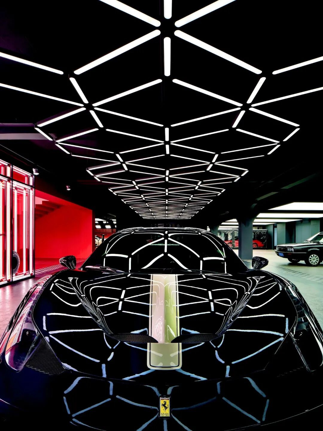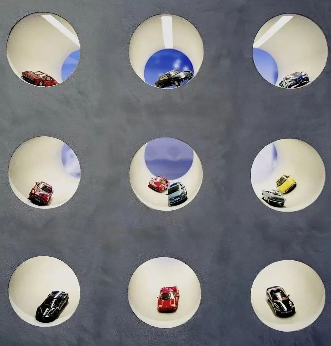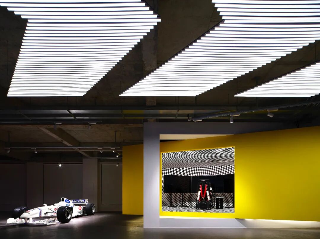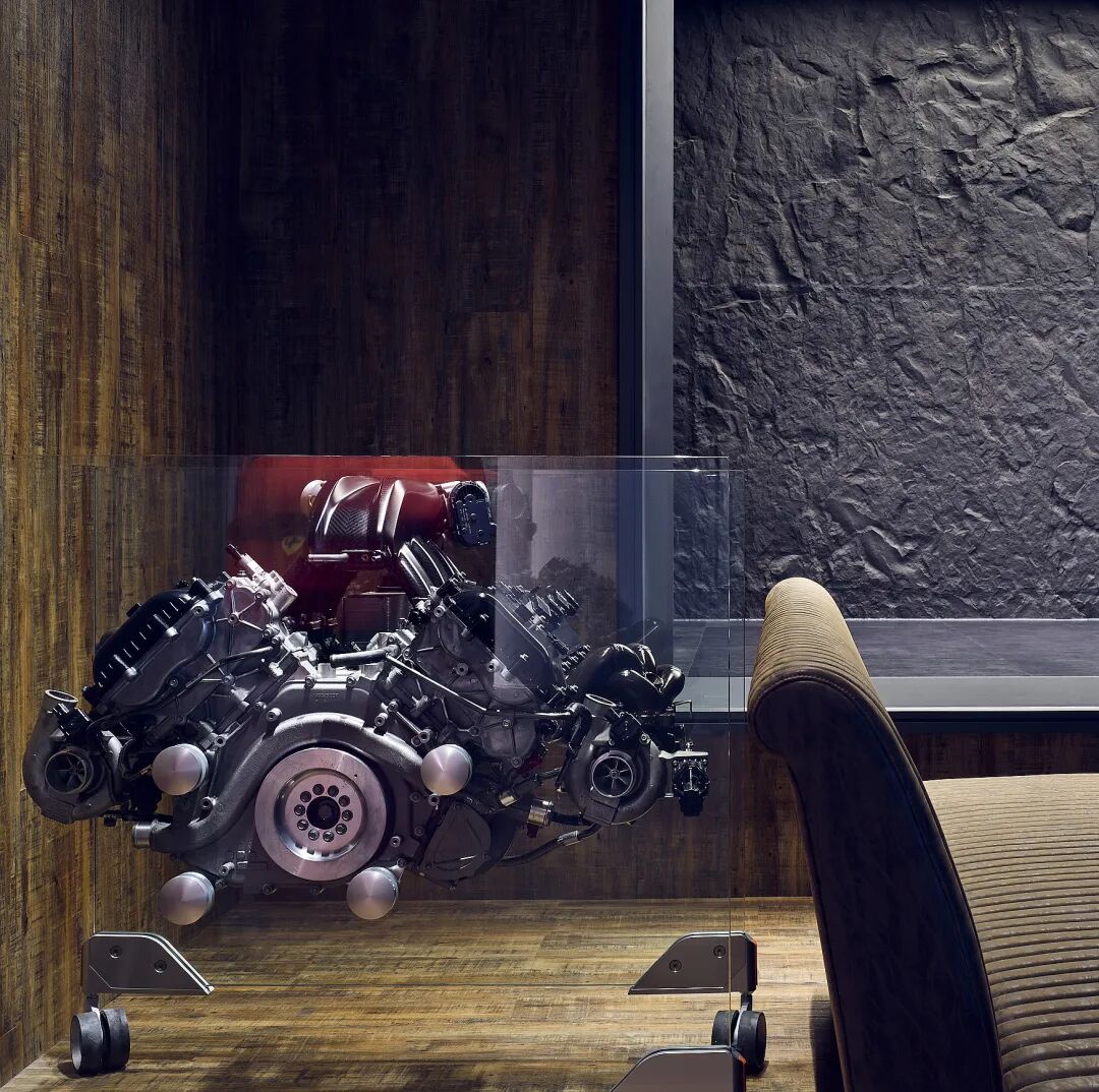 在这个项目里,功能与美是起码的,李楠对客户需求同频解读后超频落地,回过头来降维打击自然游刃有余。空间内车的生命感及与人的连接感扑面而来:舒马赫签名款赛车战服、上千个TAKARATOMY、MAISTO车模、法拉利V12引擎都如艺术珍品般陈列,整个空间沉浸感非常强。