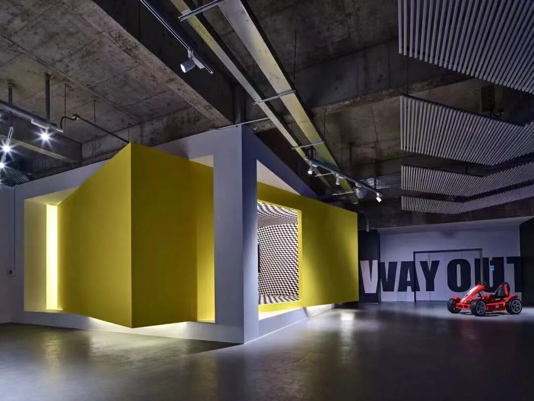 我希望它的沉浸感更强,与周围的环境足够剥离,形成一个纯粹单一的场景体验,足够专注,足够忘我——在静止空间中置入一个跃出框架的黄盒子,灵动明媚,内部是扭曲的黑白方格图案,训练的时候环境光调暗,迎接风驰电掣的呼啸吸入感。”