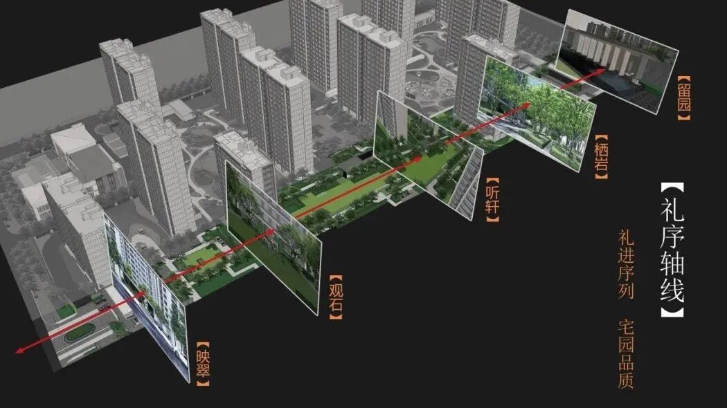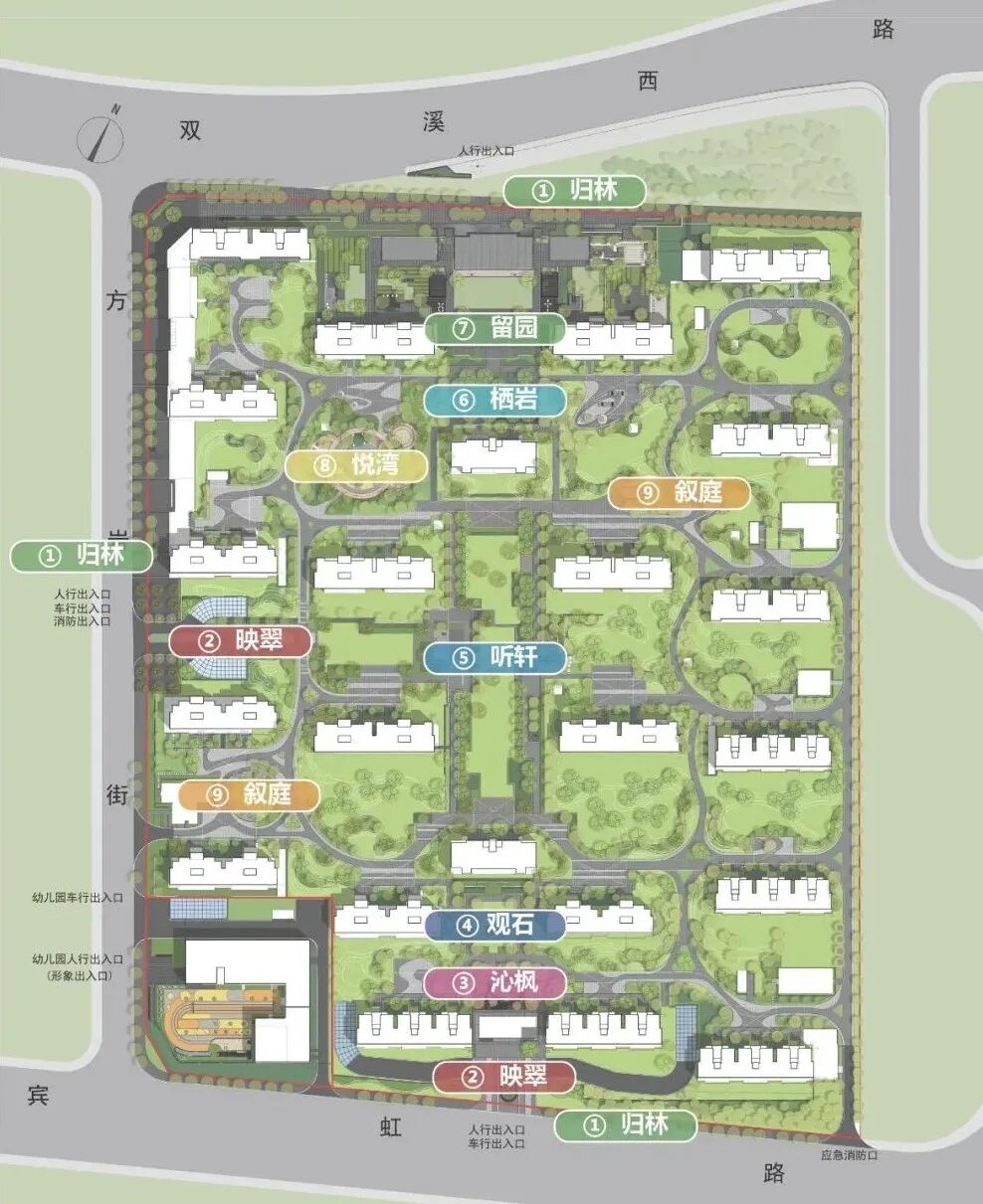 根据中轴景观结构,形成社区九大场景-归林、映翠、沁枫、观石、听轩、栖岩、留园、悦湾、叙庭,为居者提供度假场景想象,提高生活品质感,营造沉浸式的森居生活体验。