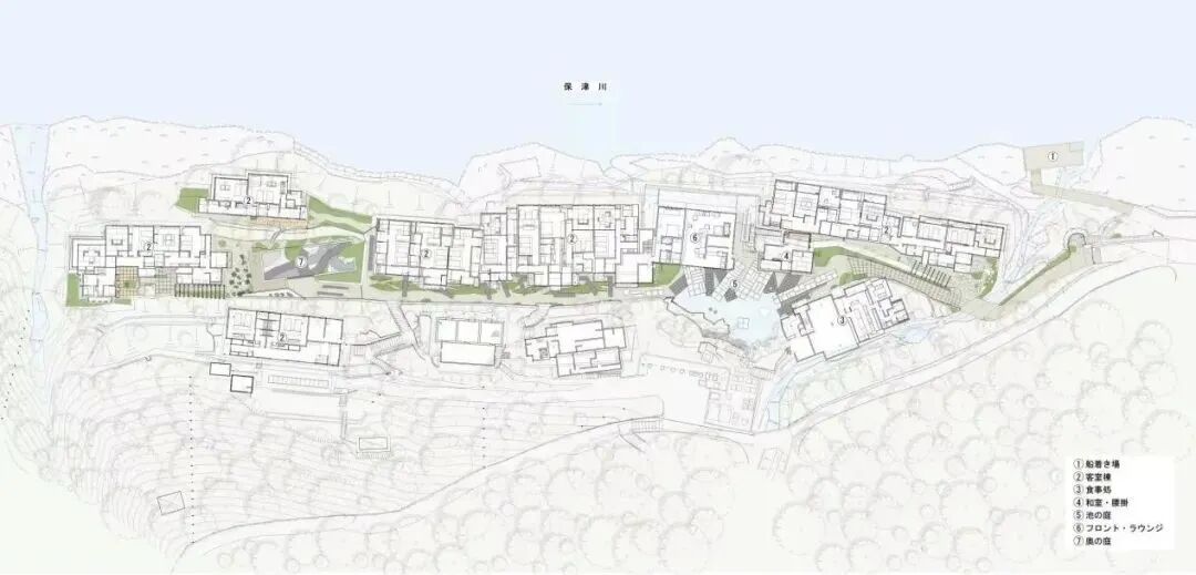 虹夕诺雅酒店的完美呈现离不开周边资源的优势与合理利用,现代风格与日式传统风格的相互交融。建筑毗邻水系而立,群落整体呈狭长型,被绿色包裹。在空间策划上以一条主轴线串联不同外挂空间,虚实结合,多重空间循序渐进。将特有的春樱、绿夏、秋枫、冬雪与酒店融为一体,四季景色皆为不同,将度假风情展现的淋漓尽致。
