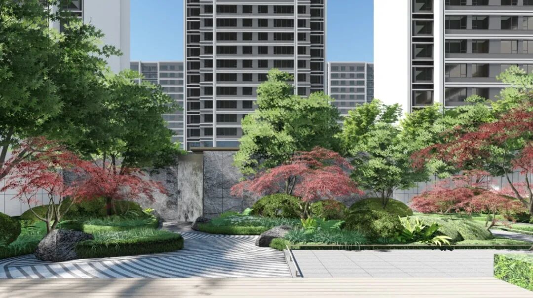 归家路径上的一进庭院:由景墙和绿篱围合成一个半封闭的静谧空间,精致的跌水缓缓淌于沙庭之上,动静结合。整个庭院植物重叠错落以红枫为主,可观四季色叶变化,形成一场视觉盛宴,让业主以游园的方式开启静谧归家之旅。