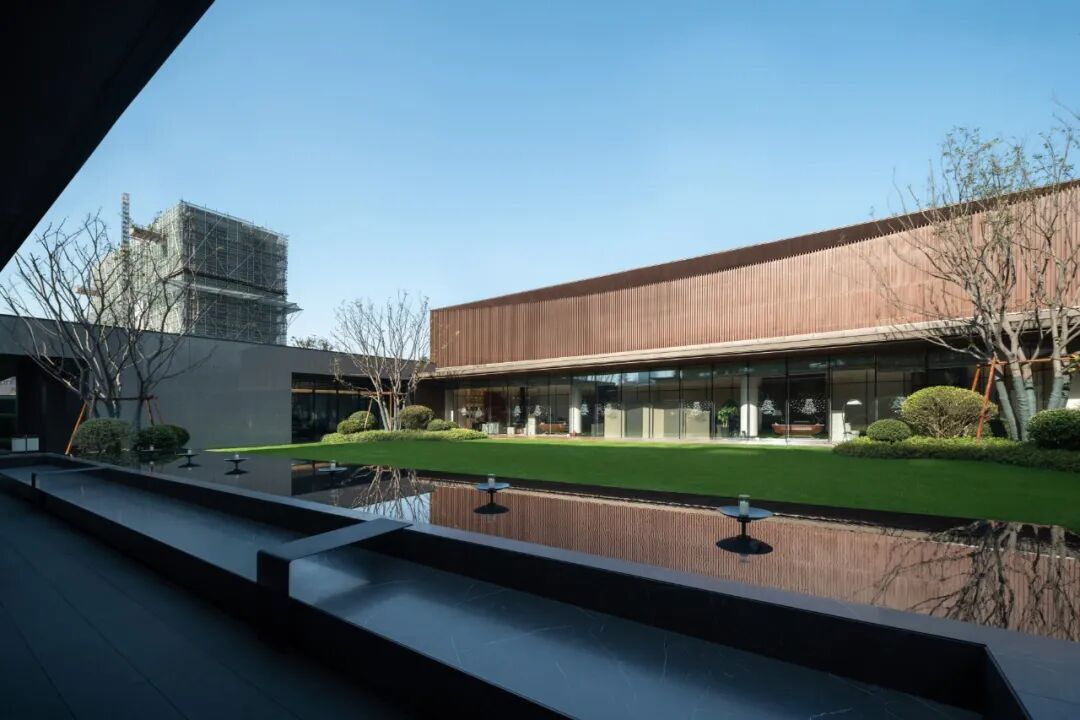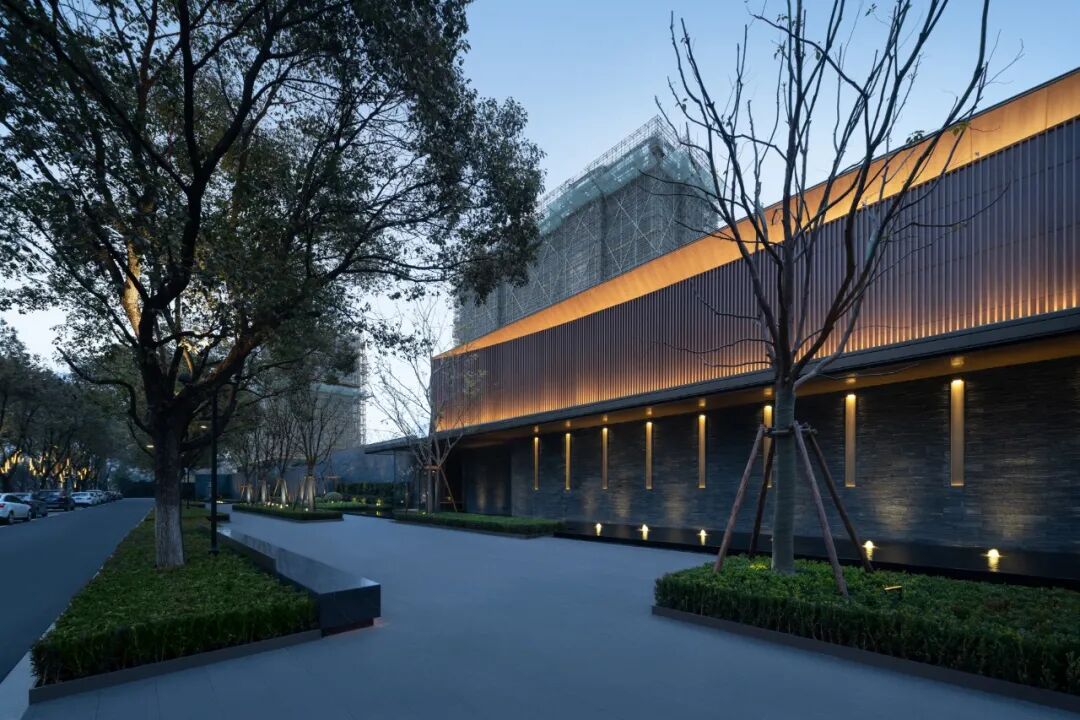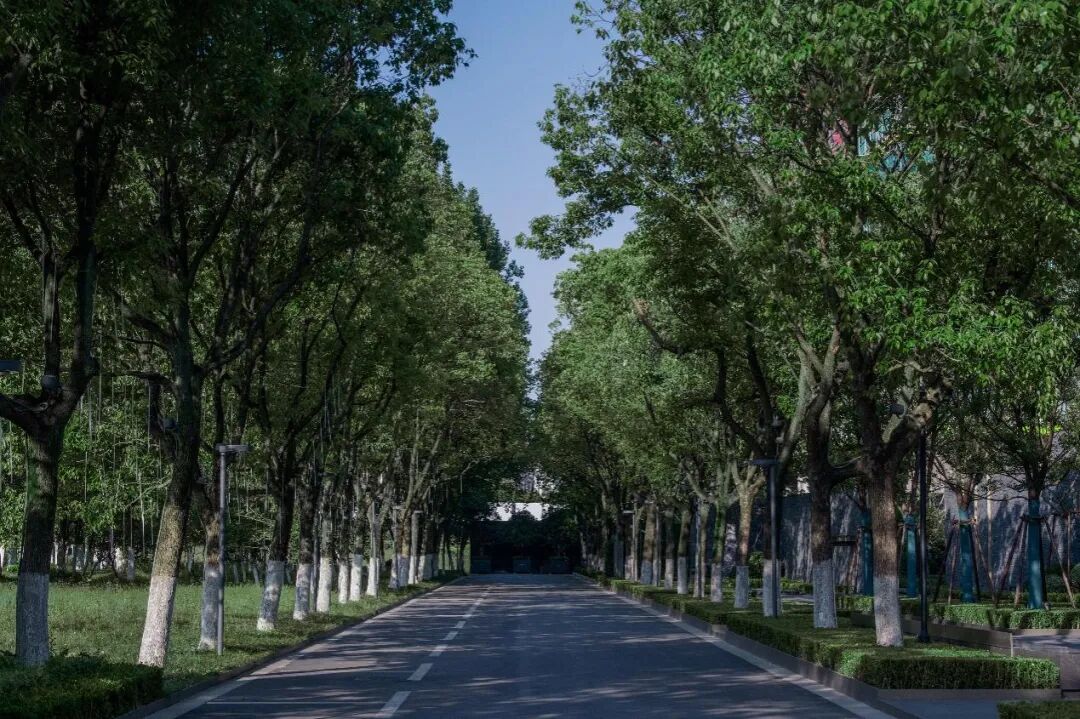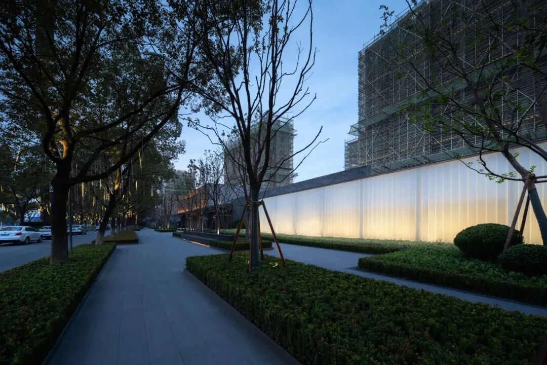 通过保留北侧以香樟形成的生态防护林、南侧城市外部界面的主动退让以及西侧商街的林荫步道,在与社区相互交融的同时又与外部道路进行区隔,灰砖长墙镜面水池掩映在树影之间,与建筑立面相互嵌合,形成虚实交错、高下交叠的变化。