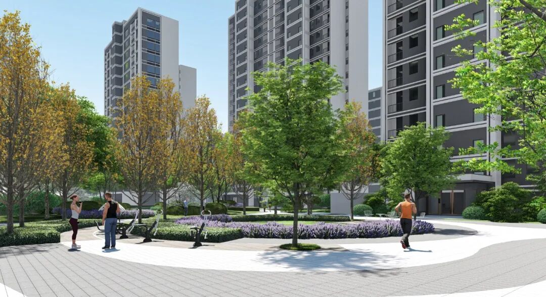 “康健恢复”、“下棋对弈”、“邻里交流”,充分关照老年人的行为特征和功能需求,贯彻场地无级设计和方便休憩的原则,结合周边绿化景观的打造,在宅间开辟出适合老人停留、休憩、交互、康复的林下绿色空间。