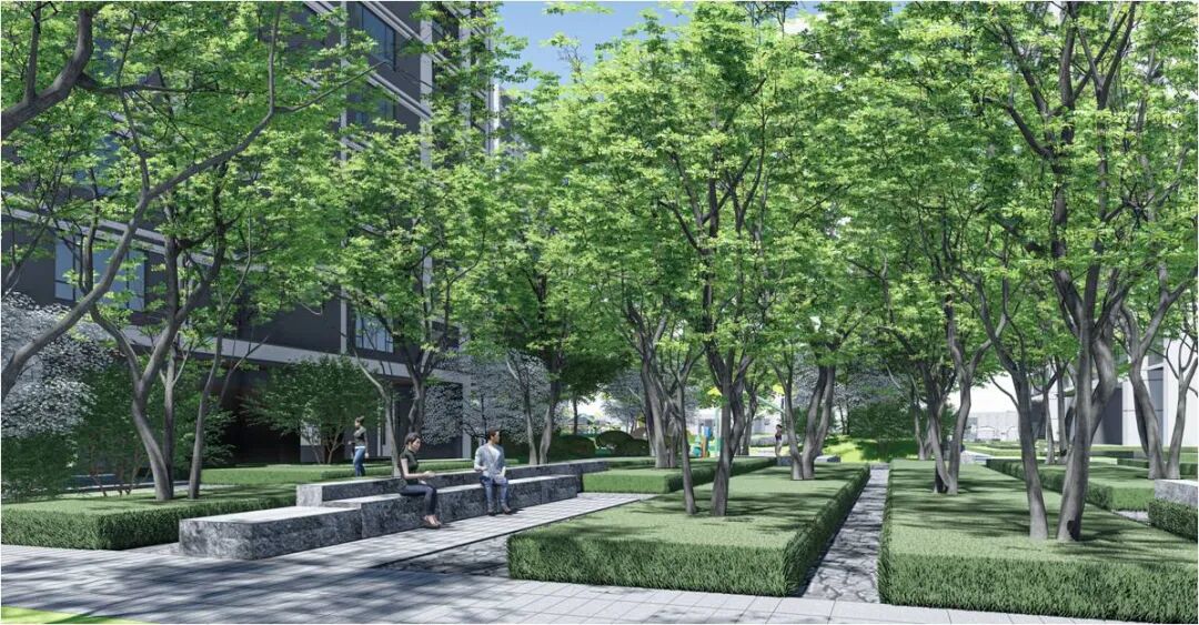 在设计景观时,我们根据与自然相融的设计理念,以及对社区未来的度假式生活愿景,不去破坏场地本身的自然资源,以原生林地成为城市道路与社区的天然屏障,通过设计增加必要的外部绿色包裹界面。