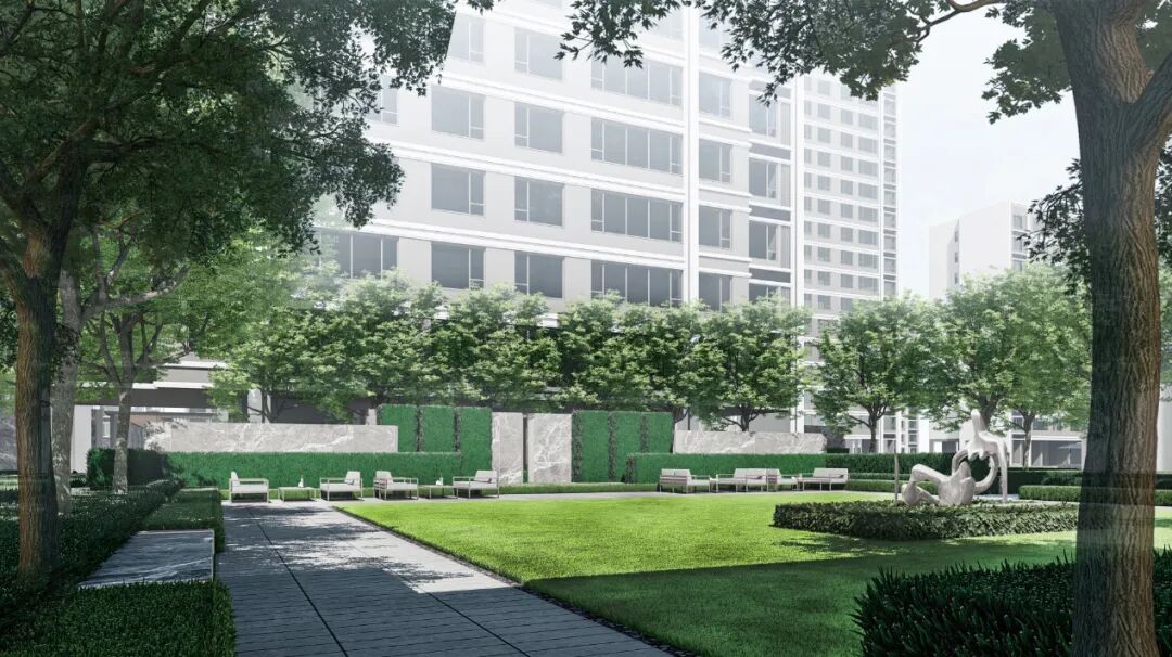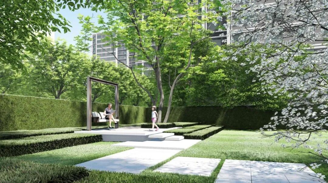 归家路径上的二进庭院:在高绿篱与景墙的庇护下,草坪中间的艺术置石形成视觉瞭望的焦点,两侧列植的香樟树阵和栀子花在固定的时节给业主带来芳香的体验,触发归家人的嗅觉记忆。
