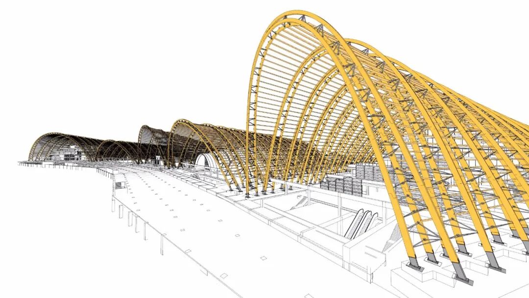 L.E :除了整体使用木构件外,还结合了钢构件的使用。这种结合保证了主体结构是木结构的基础上,同时很好地利用钢材的特性和优势。农博园的另一个结构创新是每个桁架网都是独立的,彼此不相连。这种情况下,整个桁架就可以预制成不同的子构件,而不需要整体连接在一起,并可以在到达现场后再与其他构件灵活组装。这种结构创新还保证了现场 2-3 毫米的施工公差,比钢结构现场施工准确得多。In addition to the overall use of wooden components, the use of steel components is also integrated. This method ensures that the main structure is wood, while taking advantage of the characteristics and advantages of steel. Another structural innovation of the Expo is that each truss web is independent and not connected to the next. In this way, the entire truss can be prefabricated into different sub-components, without the need to be connected together as a whole, and then assembled with other components after arriving at the site. This structural innovation also ensures a construction tolerance of 2-3mm on site, which is much more accurate than the on-site construction of steel structures.