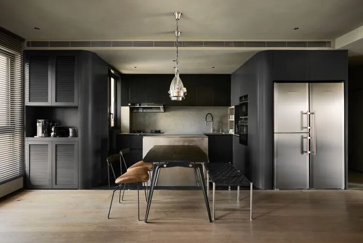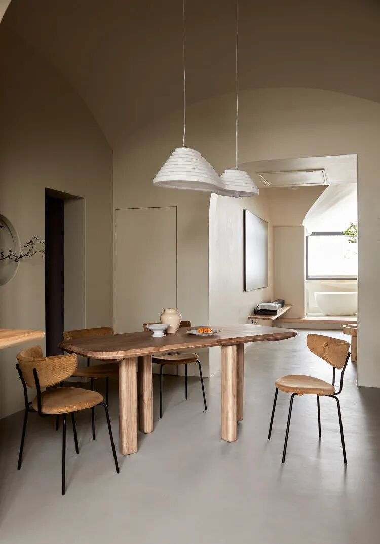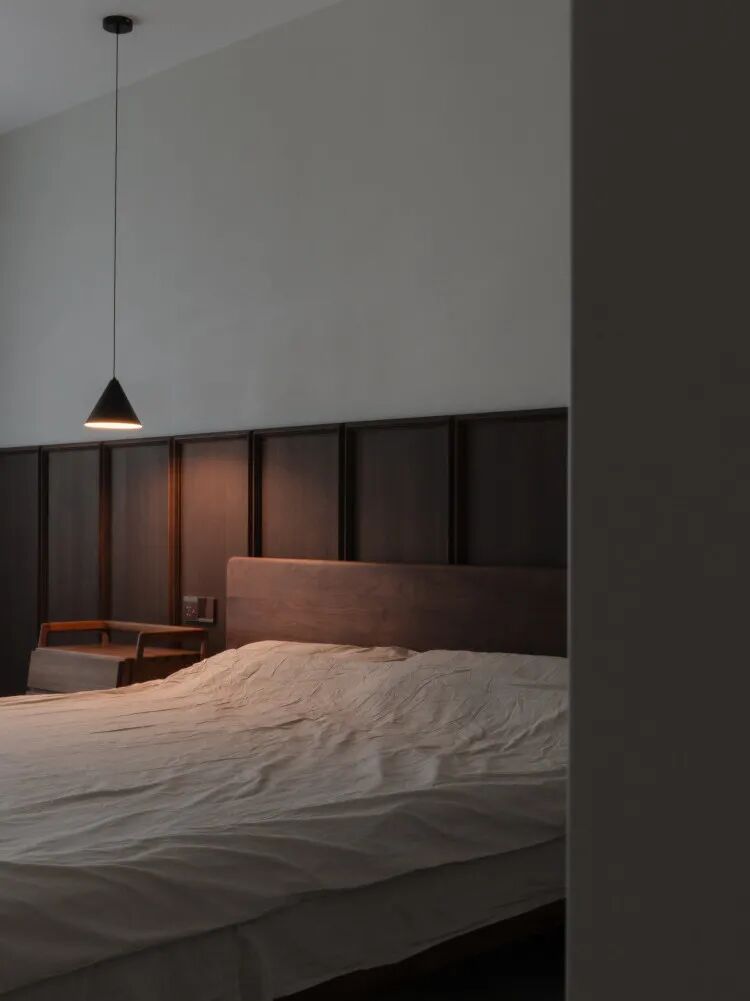跑遍市场后,25n26挑选到既有斑驳变化又能用于家装的老木头制成房梁,剩余部分切割并组装成床架放在卧室。极具韵味的木色、乐器质感的金属和自然系的墙面,共同营造出不失温度的工业风空间。封闭厨房被彻底打开,与外部空间联动,同时对称的布局也为烹饪时刻增添了仪式感。为了满足万先生妻儿偶尔来住的需求,25n26在餐厅一侧利用隔门划分出可开可合的变化区域,赋予空间成长性。