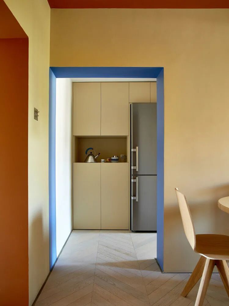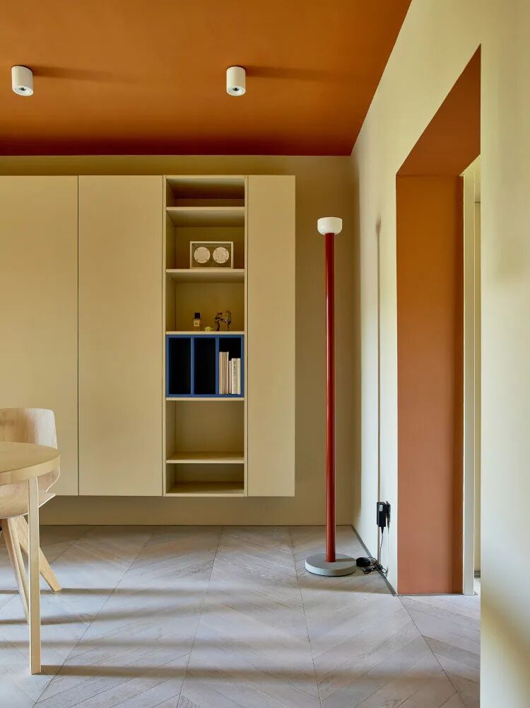 当张冬月把这套格局改动较大、颜色活泼跳跃的方案拿给毛毛时,原本还担心她难以接受,准备了许多解释,没想到毛毛没有丝毫惊讶,甚至觉得颜色可以再浓烈一些,但考虑到长期居住的视觉感受,设计师并不建议毛毛用过重的颜色,仅用1%的跳脱之蓝就足以点亮99%的温暖色调。