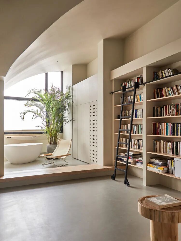 天然具有特点的空间,让设计师梁彩文兴奋不已,这意味着这个家拥有更多可能性。艾比的需求明确,有三只猫的生活需要安放,一千多本书的收纳需要解决。梁彩文将需求和空间特点相结合,塑成了一个藏书阁式的客厅,让艾比可以在这里休憩、聚会、阅读。不断延伸到各处的弧形顶面,更是打破了不同功能空间的边界,与土壤色系一起打造出治愈风的洞穴之家。