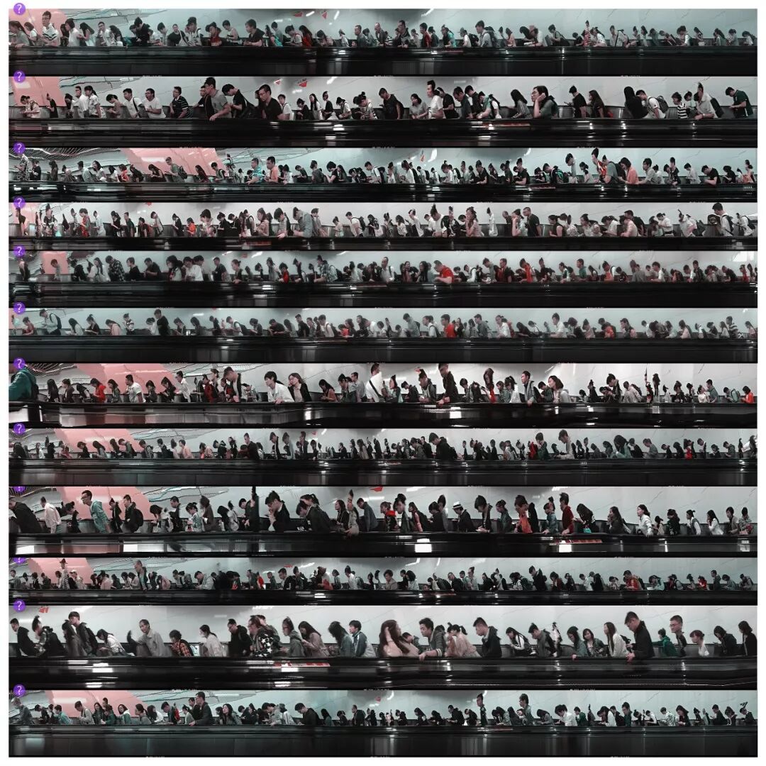 不可否认,艺术家的意识是关乎于个体的和社会的,他近期的作品《上海时间-他者的凝视》系列,发生在地铁的上下电梯上,他没有将群体中的人模糊化,而是将那些表情放大拉长甚至缺失在图像中,以佐证艺术家的影像内容的可读性。
