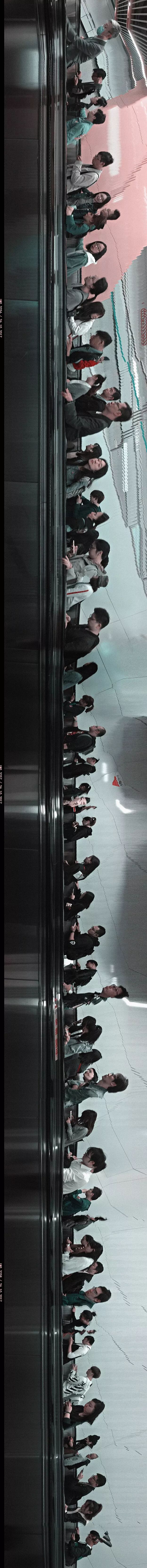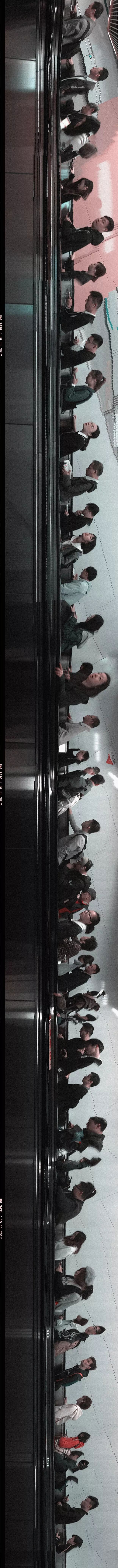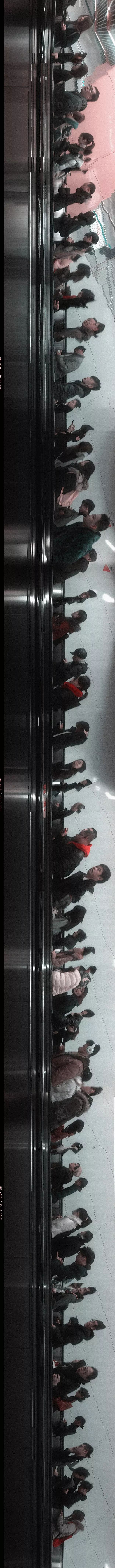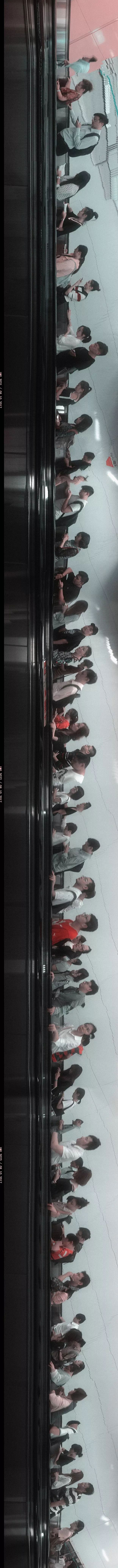 不可否认,艺术家的意识是关乎于个体的和社会的,他近期的作品《上海时间-他者的凝视》系列,发生在地铁的上下电梯上,他没有将群体中的人模糊化,而是将那些表情放大拉长甚至缺失在图像中,以佐证艺术家的影像内容的可读性。