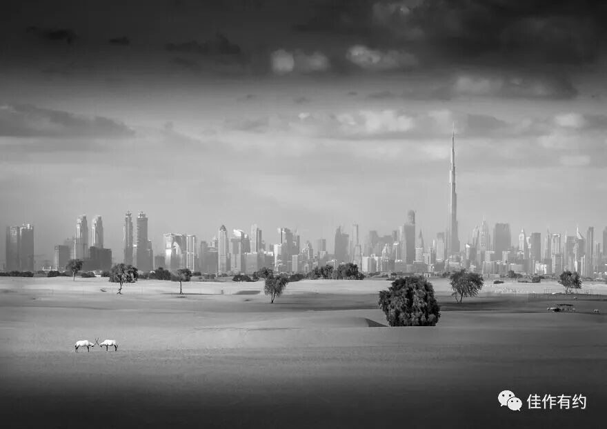 “耐心的旅程让我看到了这张照片,因为我进行了多次侦察旅行才能确定这个地点,甚至多次访问该地点,最终找到了云彩点缀的晴朗天空,而一对大羚羊正在进行他们的领土竞争。由此产生的照片既代表了动物的对抗,也代表了迪拜严酷的城市形态与阿联酋沙漠沙丘的自然柔和轮廓的对比。”