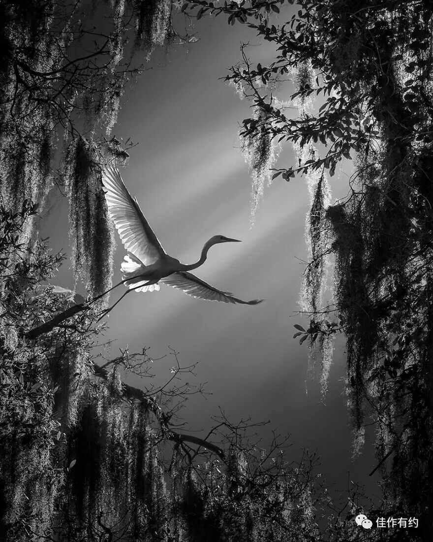 “在佛罗里达州中部的 Kraft Azalea Garden 无数次旅行之后,我在 2022 年 2 月下旬捕捉到了这个美丽的时刻。在将彩色图片转换为黑白图像的后期过程中,我在 Lightroom 中将原本蓝色的天空调暗了. 将文件传输到 Photoshop 后,我还使用数码喷枪将图像的特定区域变暗,然后为背景添加灯光,创造出一个只能存在于想象中的神秘梦幻世界。”