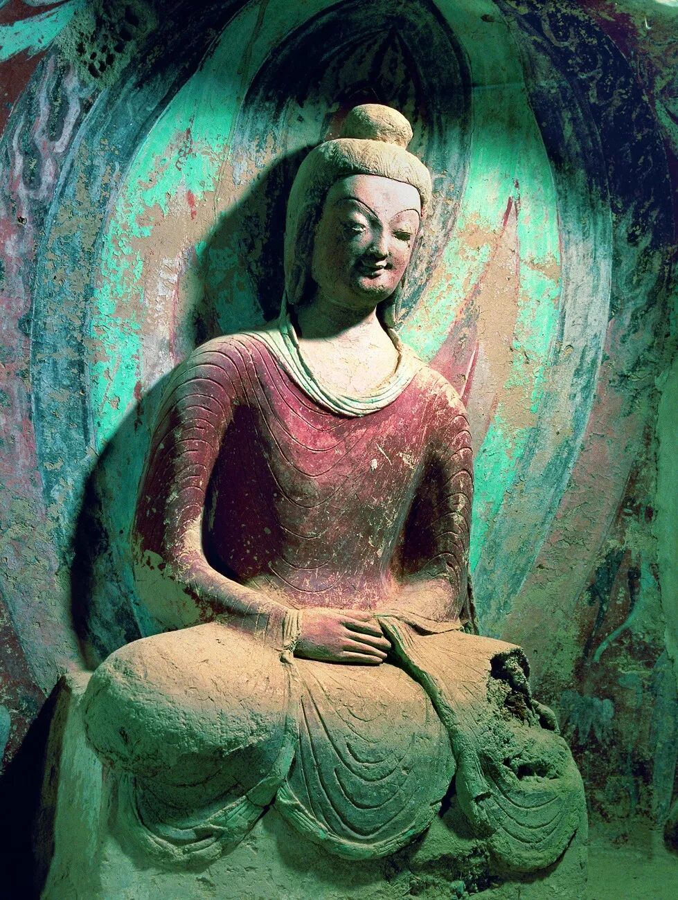 莫高窟259窟彩塑佛像(北魏)。北魏时的造像有一个很明显的特点:都具有平易近人的“微笑”。这种衣服上的“u形”花纹是模仿印度的造像。摄影/茹遂初