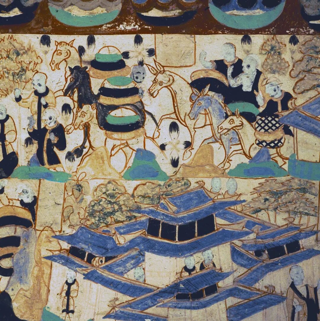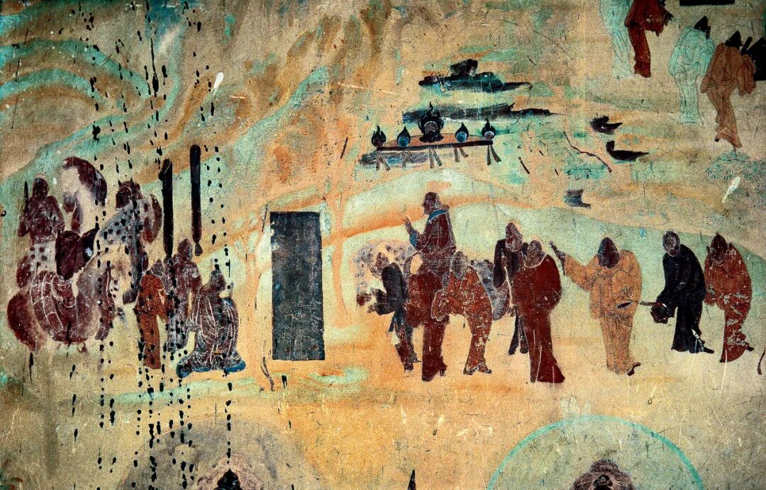 莫高窟296窟福田经变中的商队(北周)。右下角的人物穿着对襟式衣服,流露出汉化痕迹。从中也可看出当时的建筑风貌。北周时期的人物也有民族特色。摄影/茹遂初