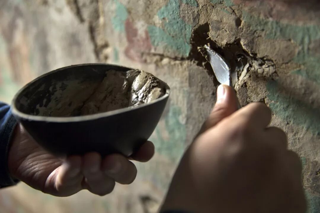 敦煌壁画的修补,可以看出其中泥的使用。摄影/孙志军