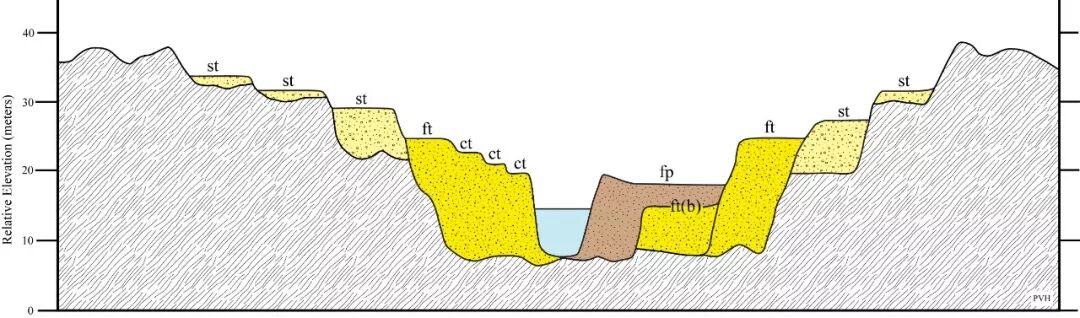 地壳抬升时,原来的河谷底部会被整体抬上来,而河流下切,就会在外围出现不再被水淹没的部分,形成台阶状的“阶地”。一般而言,有几级阶地,地壳就抬升了几次。阶地面相对平坦,阶地陡坎相对竖直。图/wikipedia, Cristellaria