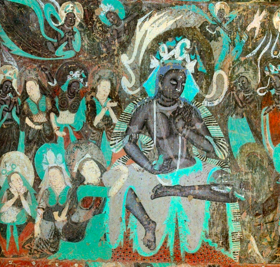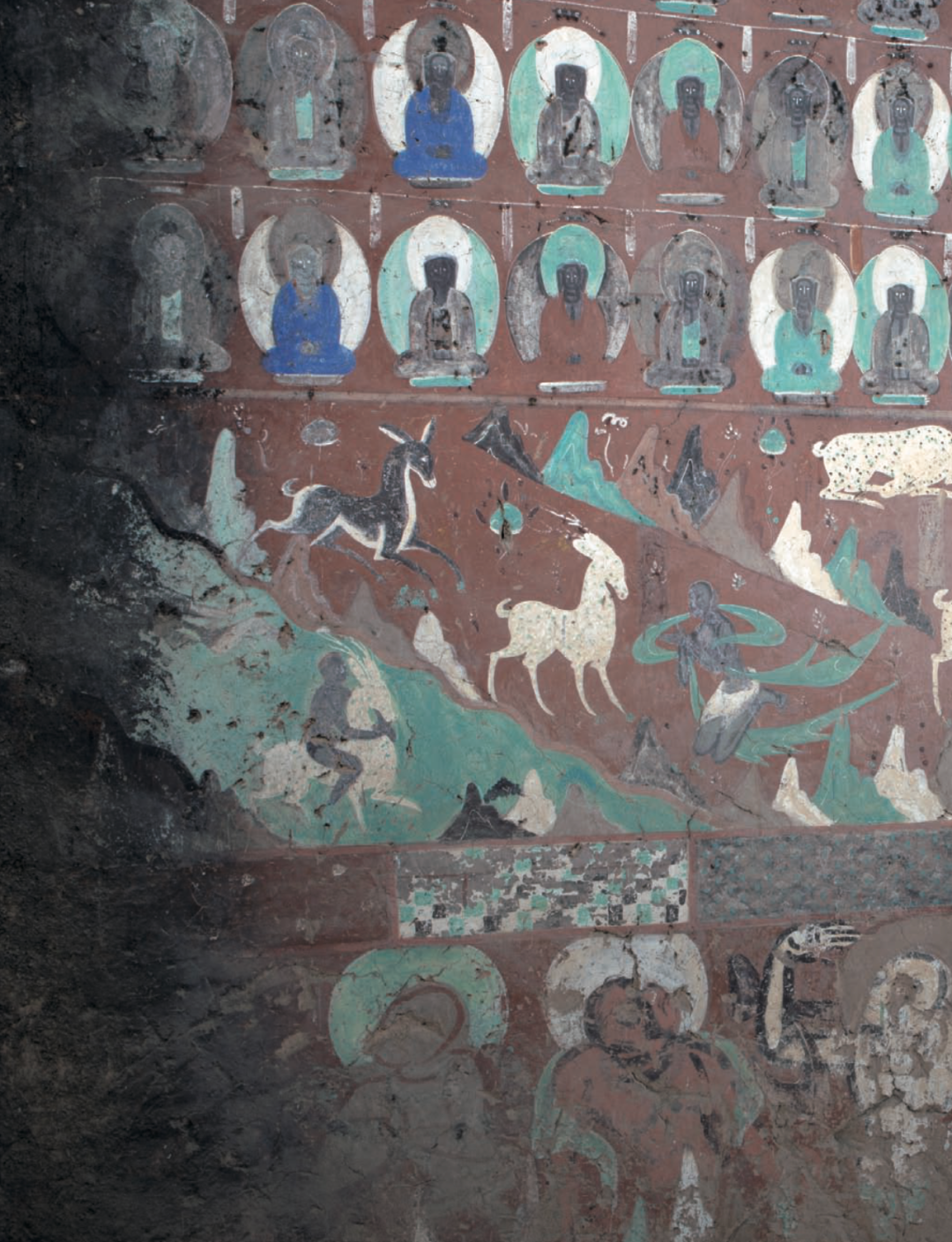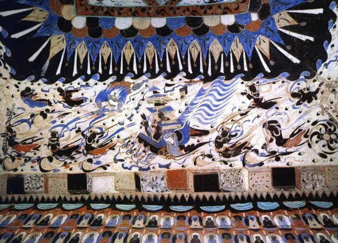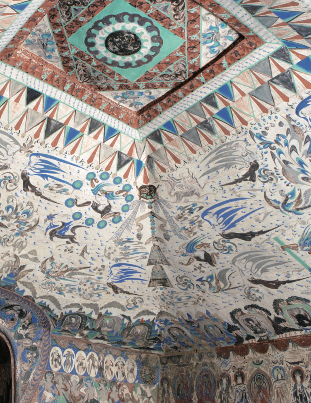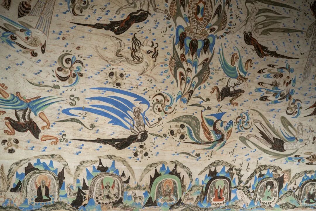 敦煌莫高窟第 285 窟,窟顶。窟顶遍绘中国传统神话诸神与佛教护法神形象,西披画雷神、飞廉、化生、飞天、 猕猴等,绕边沿一周为坐禅僧形象。图\《世纪敦煌》