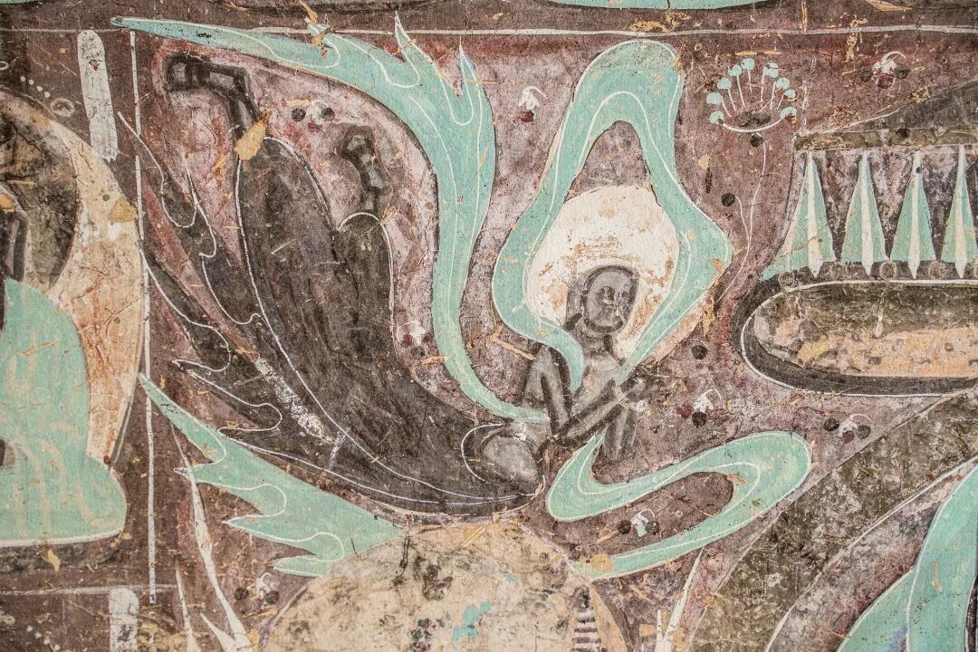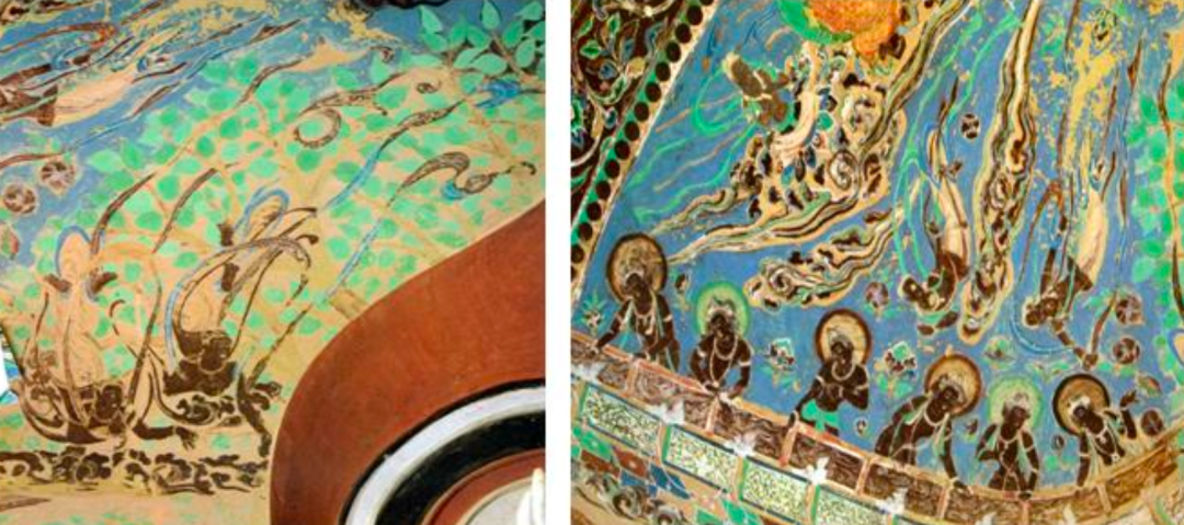 这种新出的飞天具有龟兹、克孜尔等石窟飞天的风格,飞天形象身躯短壮,动态朴拙,造型较北凉时期要丰富一些,不单单是静止、呆板的男性静态造型,飞天中出现了大量的伎乐场景,动感十足。