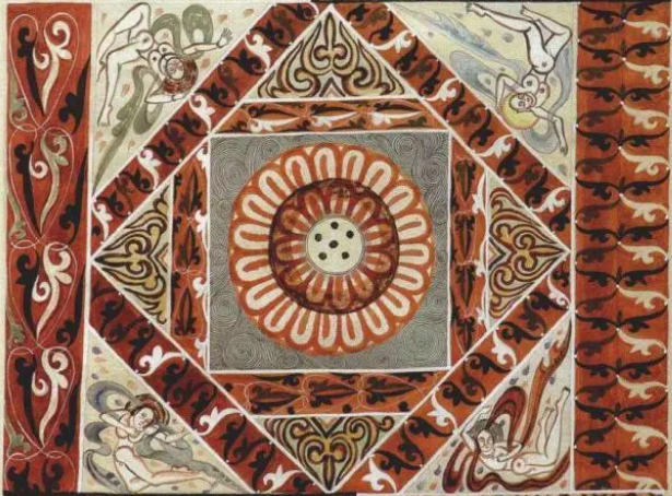 整个图案极具莫高窟早期平棋图案的风格特点,结构简炼,纹样较少,方中套圆,静动相衬,人物造型粗犷朴拙。
