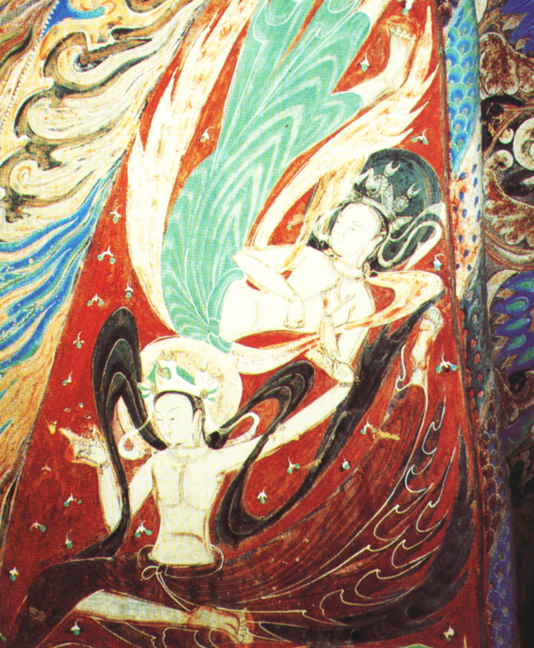 不再像西域式飞天哪样笨拙,色彩的搭配上也较为清秀自然,西域式飞天的野性色彩渐渐消失,整个飞天造型的感觉更具有中国文化的审美。