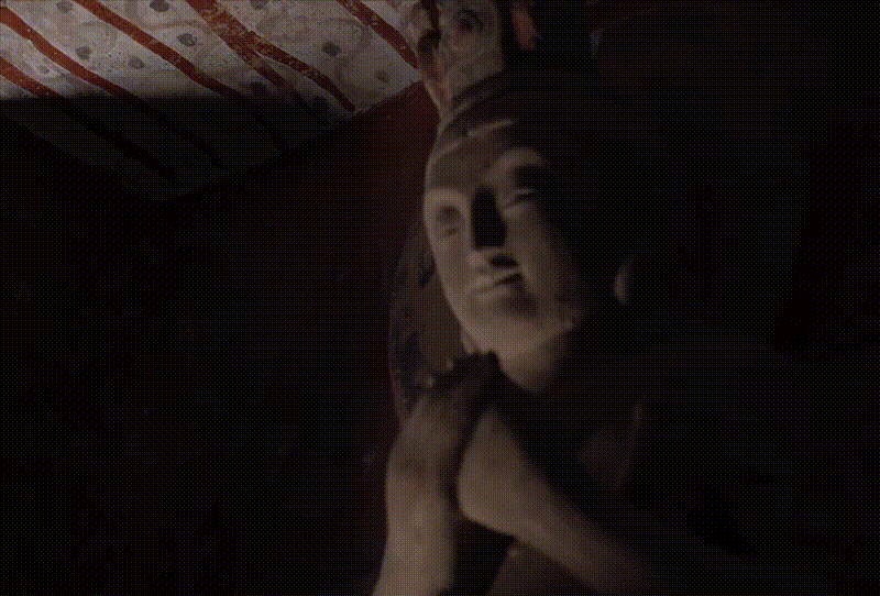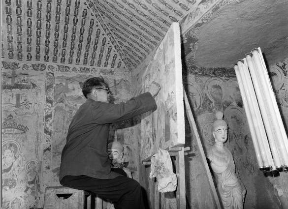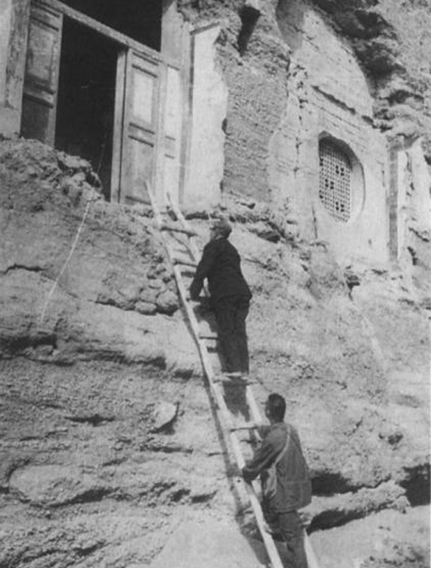 自己用木头做爬梯,没钱买颜料,就用在当地的泥土中提取,晚上没有灯,就用绳子把自己悬在半空中,借用煤油的微光一笔笔的临摹壁画。