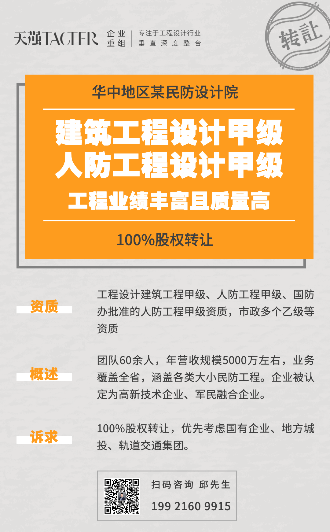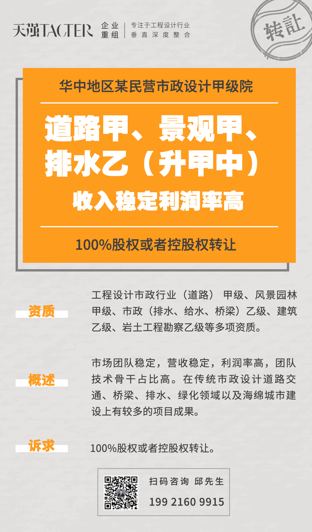 我们长期持续寻找并收购具有建筑工程设计甲级资质的企业,优先考虑壳公司,或小规模团队、少量债权债务的工程设计公司,可接受股权100%全资收购。以上具有意向的企业,请与我们联系。