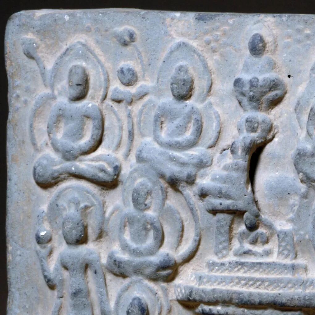 善业佛(善业泥)的中部为佛塔,塔分三级,上两层各坐一佛,底层释迦、多宝并坐。画面有十佛、二菩萨、二托塔力士,构图饱满,左右对称。
