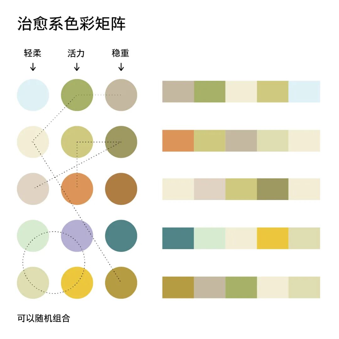 治愈系色彩空间,重点是颜色发暖,且淡雅,明亮色调。主色更要发暖,特殊主题可以选择冷色,总之面积大的颜色选择浅色,以这样的方式来配色就。