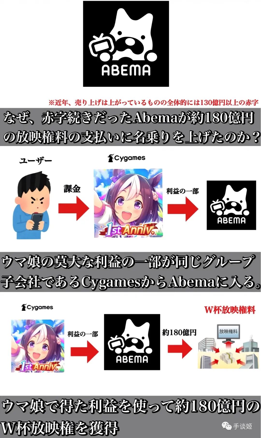 有关《赛马娘》这个游戏,和它的制作公司Cygames,这里就默认姬友们都已经了解了,具体来说,当然不是在《赛马娘》中安插了世界杯比赛,而是Cygames的母公司CyberAgent,它旗下和朝日电视台有个网络电视服务,叫AbemaTV,将会转播世界杯。