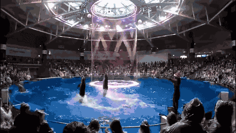 观众一边享受着不断变化的炫彩灯光秀和环绕立体的动听音乐,一边欣赏着海豚从水池里不停地旋转、跳跃以及摆着各种卖萌的造型。他们被海豚的欢乐感染,忍不住手舞足蹈。