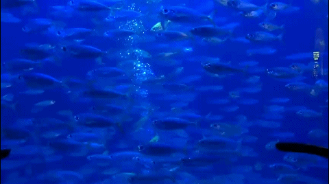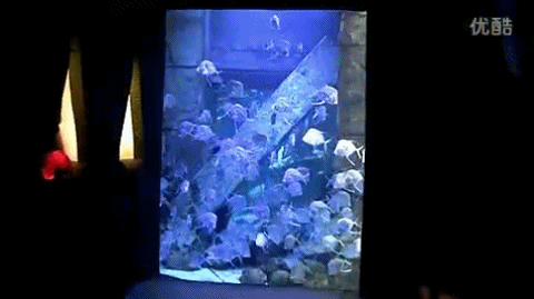 这幽暗的光主要来自各个区域的水族箱,他们仿佛一幕幕深海光画,让参观者仿佛置身于凡尔纳小说《海底两万里》中的奇妙世界。游客站在“虚拟水族馆”的展示大屏幕前,几十种海洋动物渐次出现在屏幕上,并向他们游来。这些海洋生物会根据游客的动作做出各种各样的反应,摇尾巴、眨眼睛、发出恐怖声音的,甚至会气鼓鼓地涨圆肚子……