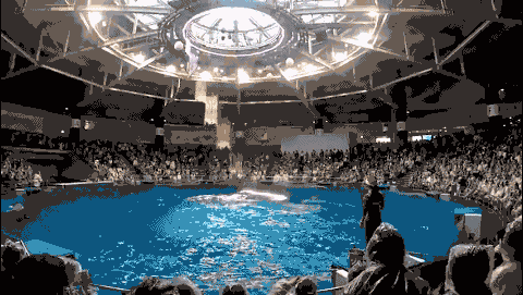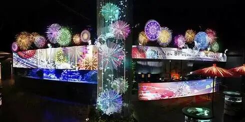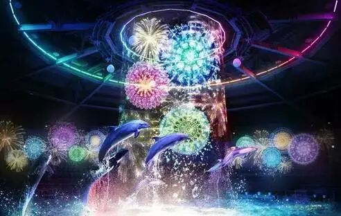 如果你觉得单纯的海豚表演不过瘾,不妨期待一场夏日烟火特别灯光秀。夜幕降临,圆形水幕和水箱壁上投射出银河与烟花的影像,水珠被墙壁弹开变成烟花的景象,清凉感和光感同时存在,仿佛欣赏着冰火两重天的景象。其中,夏日烟火特别灯光秀结合了代表夏日的烟火和金鱼2个元素,营造出缤纷清凉的视觉飨宴,将夏日的诗意尽收眼底。