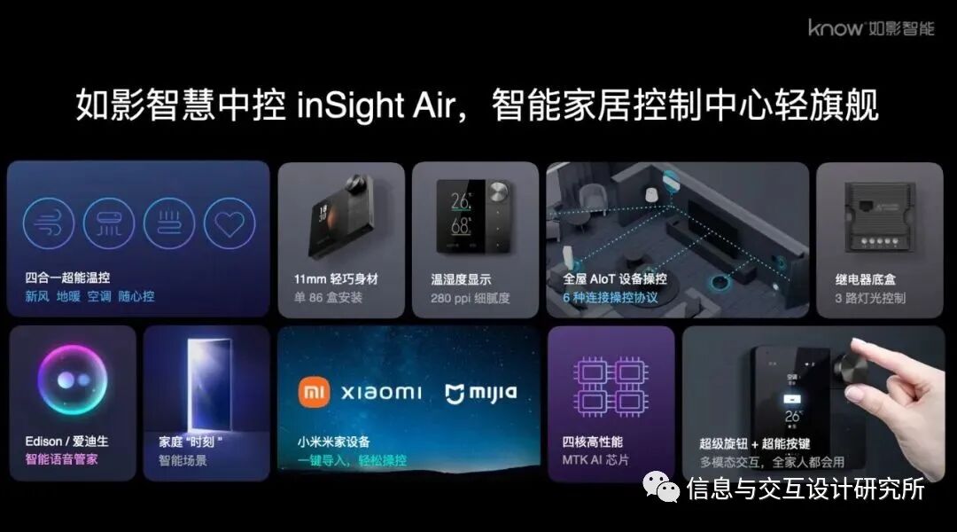 如影智慧中控inSight Air集智能面板、网关和语音控制于一体。同时,还融合智能音箱、多功能网关、智能门禁、四合一温控、智能闹钟、湿温度计、智能开关和音乐播放器功能于一身,将多种功能集于方寸之间,为用户展现极致的智慧中控服务。