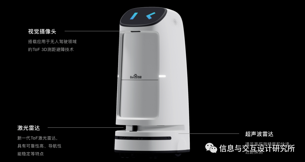 机身搭载了 1 颗激光雷达,4 颗超声波传感器,4 个 TOF 视觉传感器,用以提升机器人感知范围和感知精度。基于百度最新研发的运动平台,通过视觉和激光双融合的定位导航算法,可以实现精准定位、灵活导航。