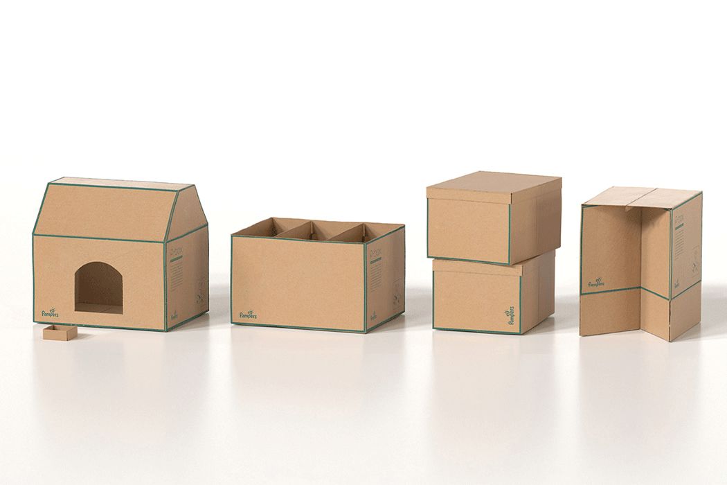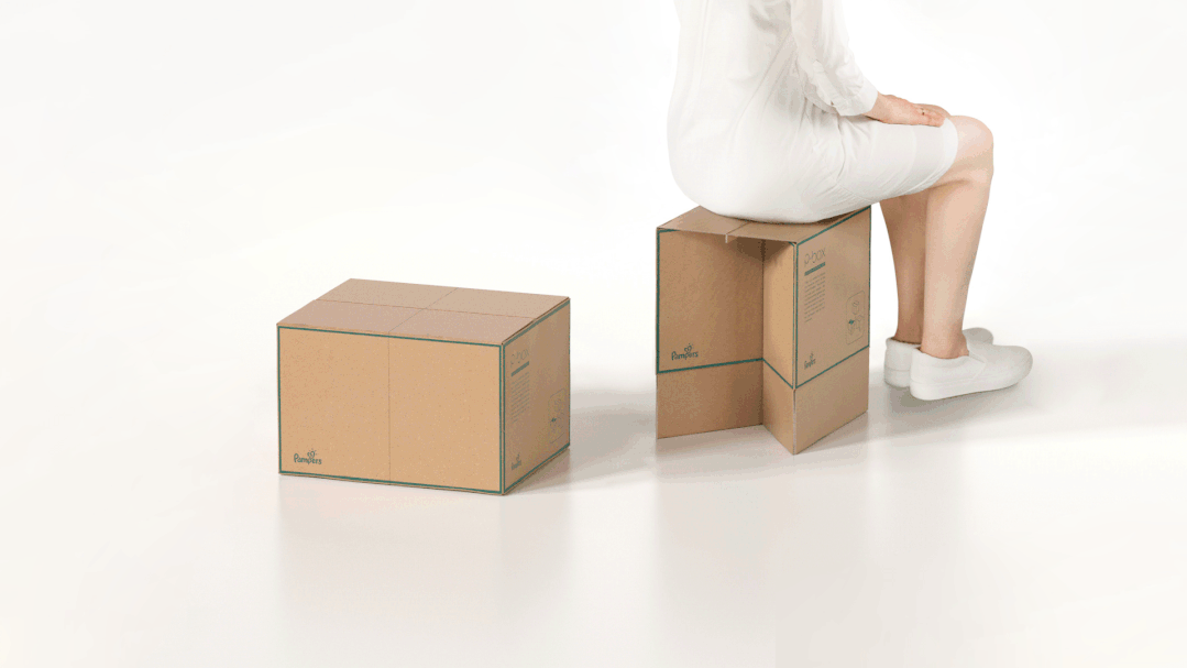 P-Box可以帮助尿布品牌减少包装浪费。P-Box将这些纸板箱变成了日常使用的创新物品,让它有了新用法。可以用作猫窝,或是一种轻便的凳子,也可以收纳物品。