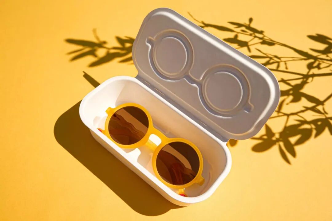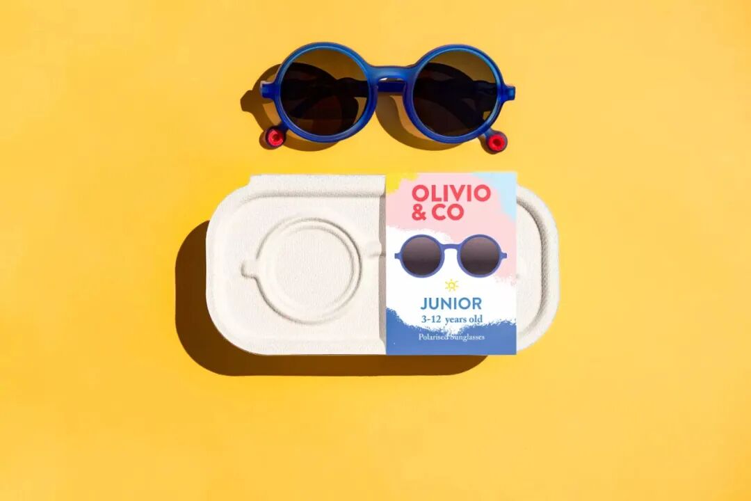 Olivio & Co每副太阳镜都装在一个可生物降解的、模塑的甘蔗渣纸浆翻盖盒子里。盒子坚固而轻便,可以定制不同颜色。