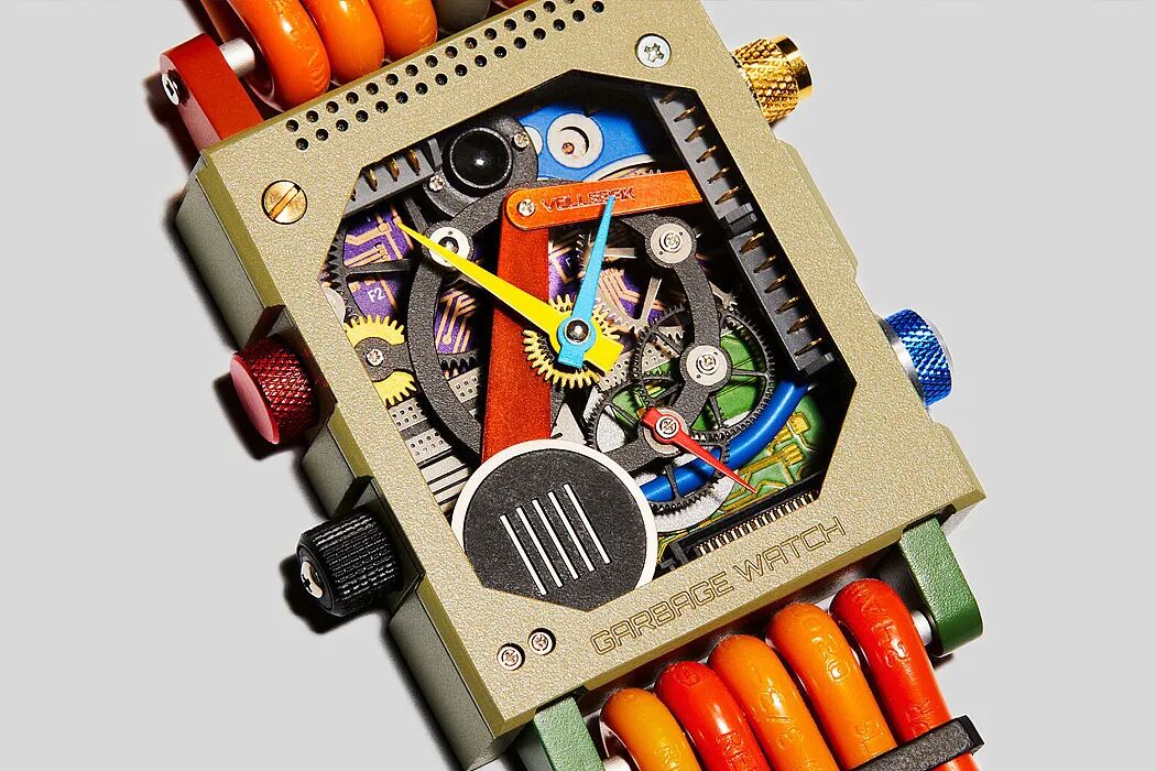 Garbage Watch本身拥有一个镂空表盘,可以显示出手表内部各式各样的色彩。电线似乎形成了腕带,而螺丝和表盘的不匹配赋予每只手表独特的“外观“,使其脱颖而出。