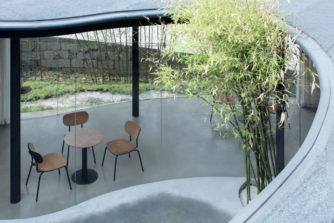 该设计最大限度地保留一草一木,试图建立当代建筑与自然乡村的对话,一座圆形小青瓦房,被竹林包裹着,与周围竹林、树木,与远山、田野相得益彰。