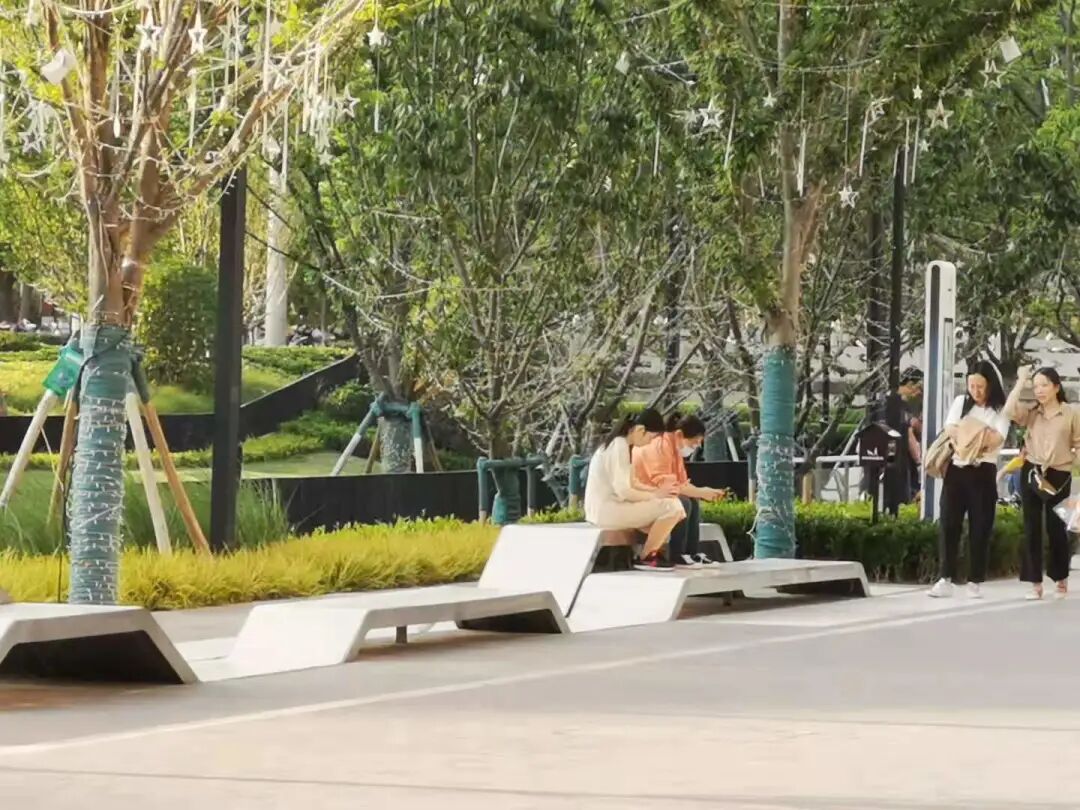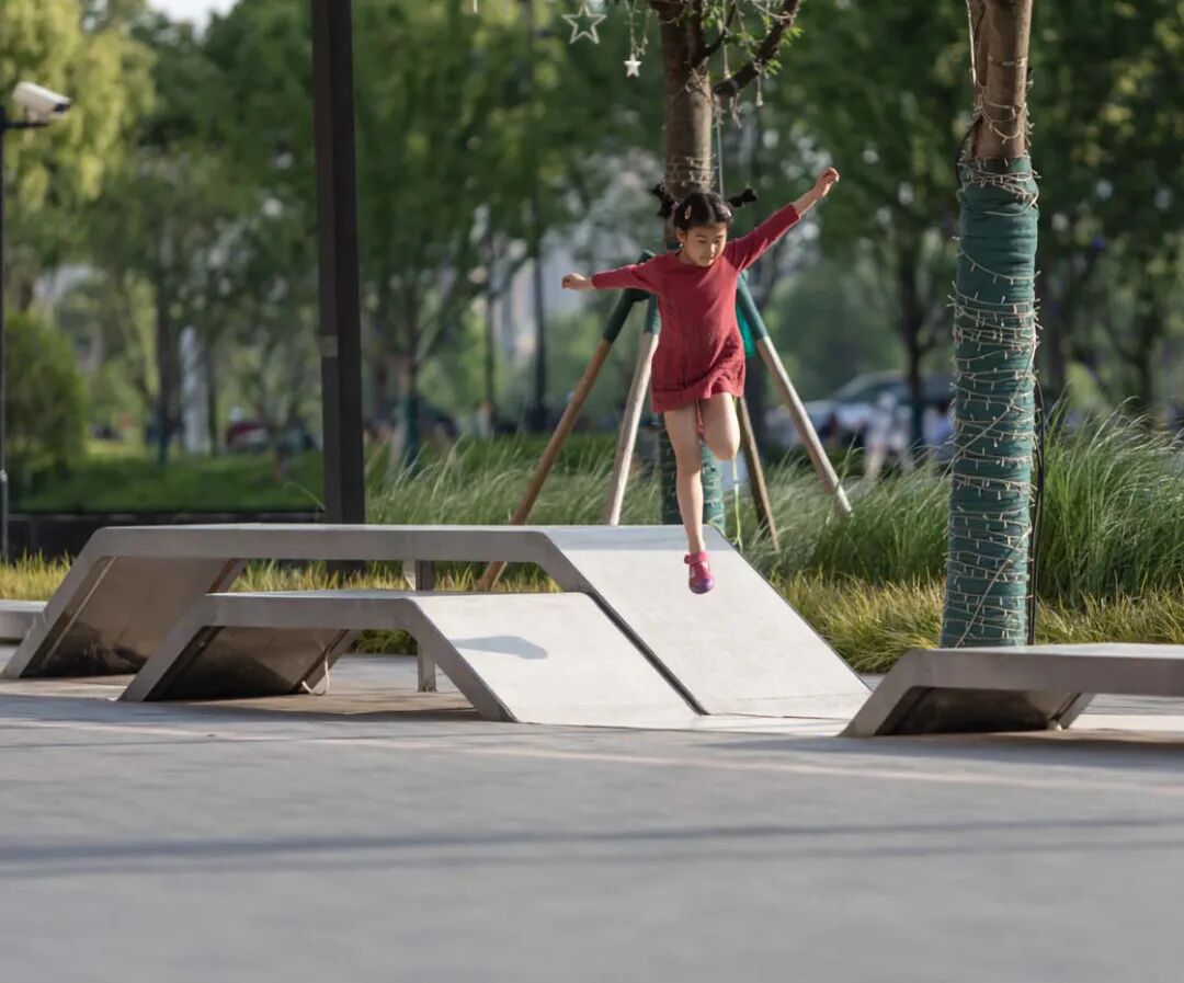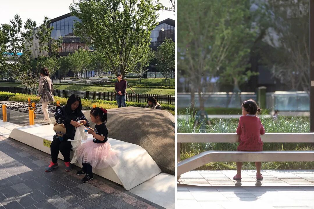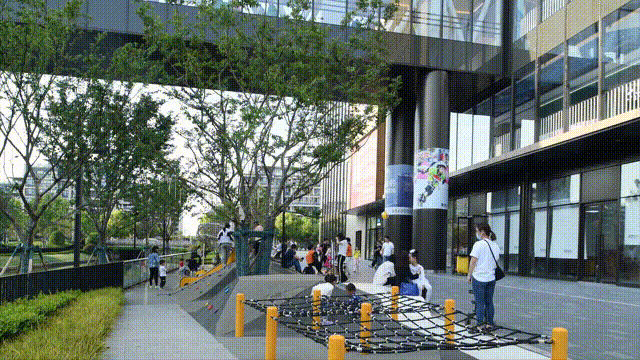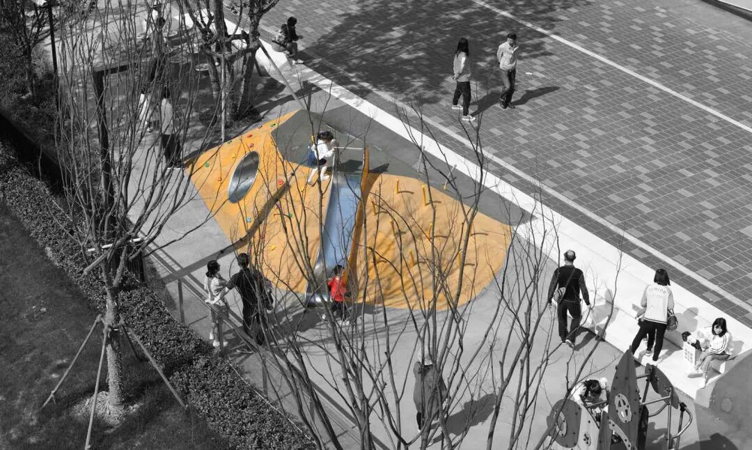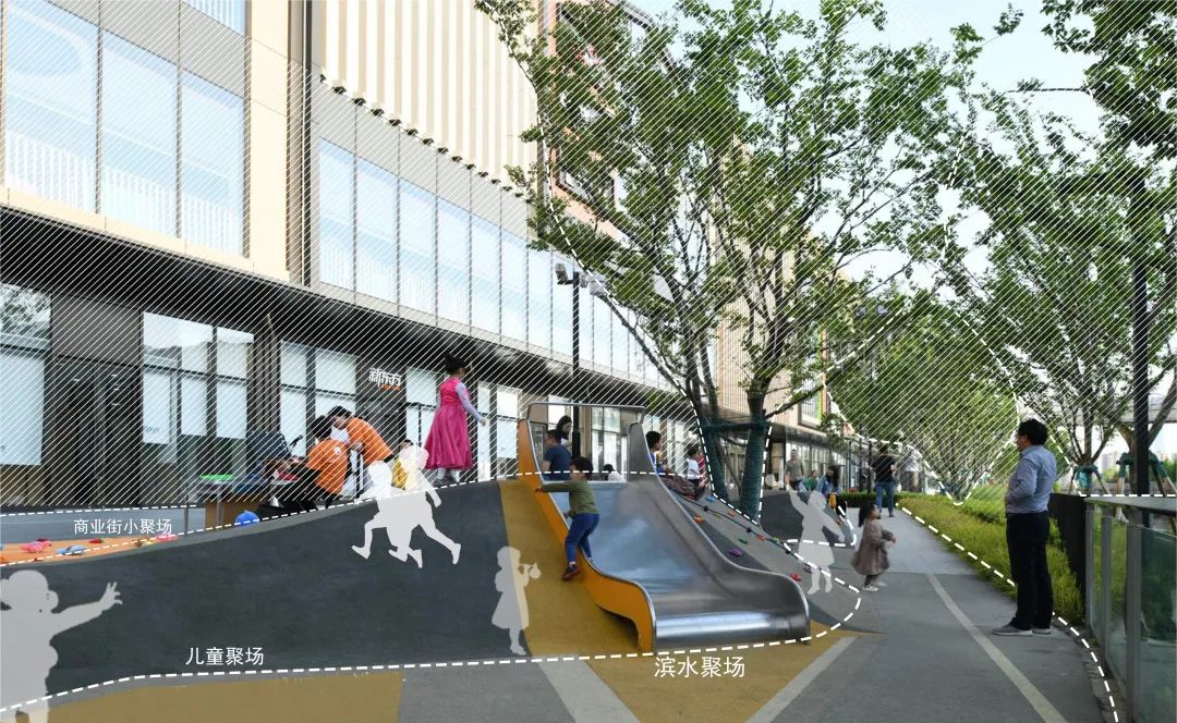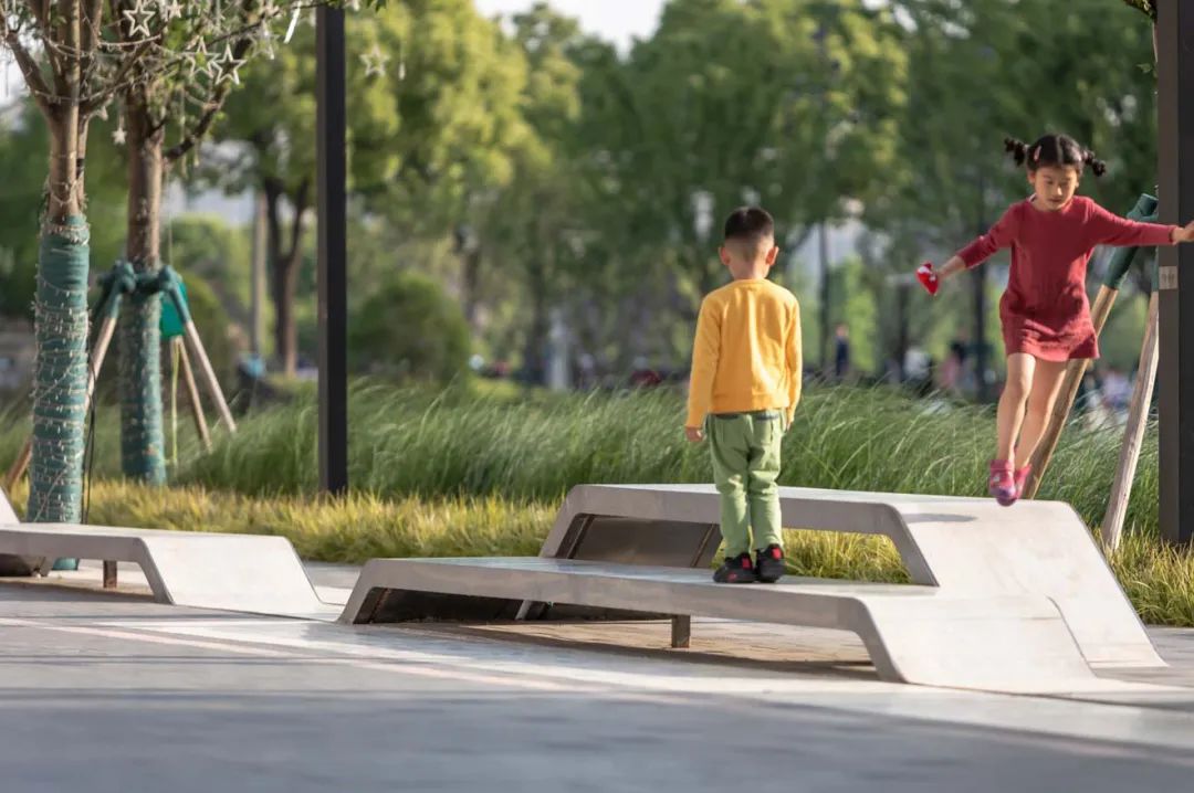 东侧滨水空间比较局促,沿着消防通道,一条线性互动家具把商业前场和滨水绿地有效的联系在了一起。把本来非常消极的冷区打造成了全时段的非正式儿童活力舞台。