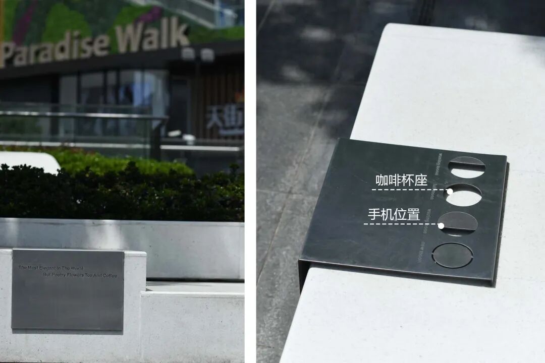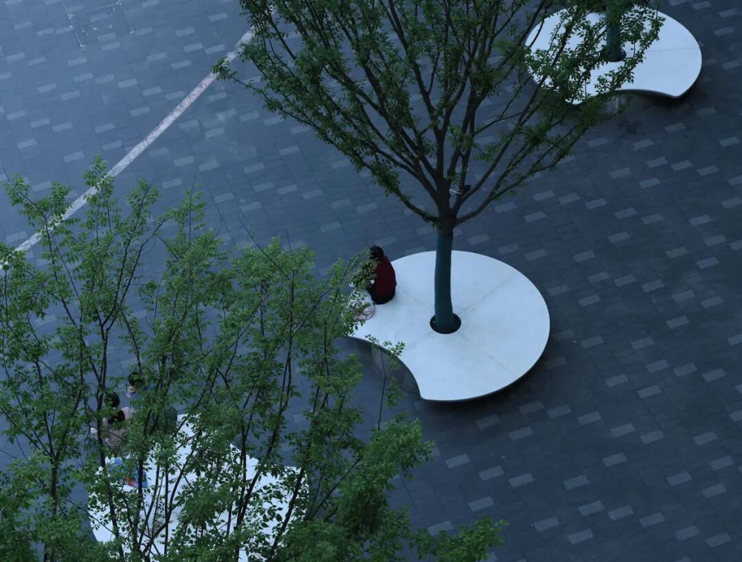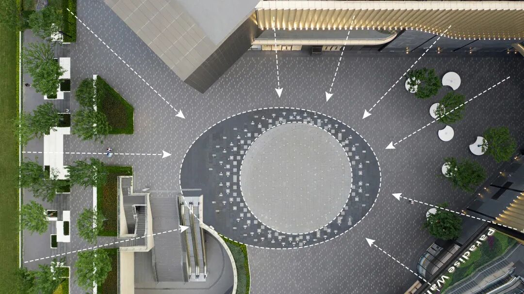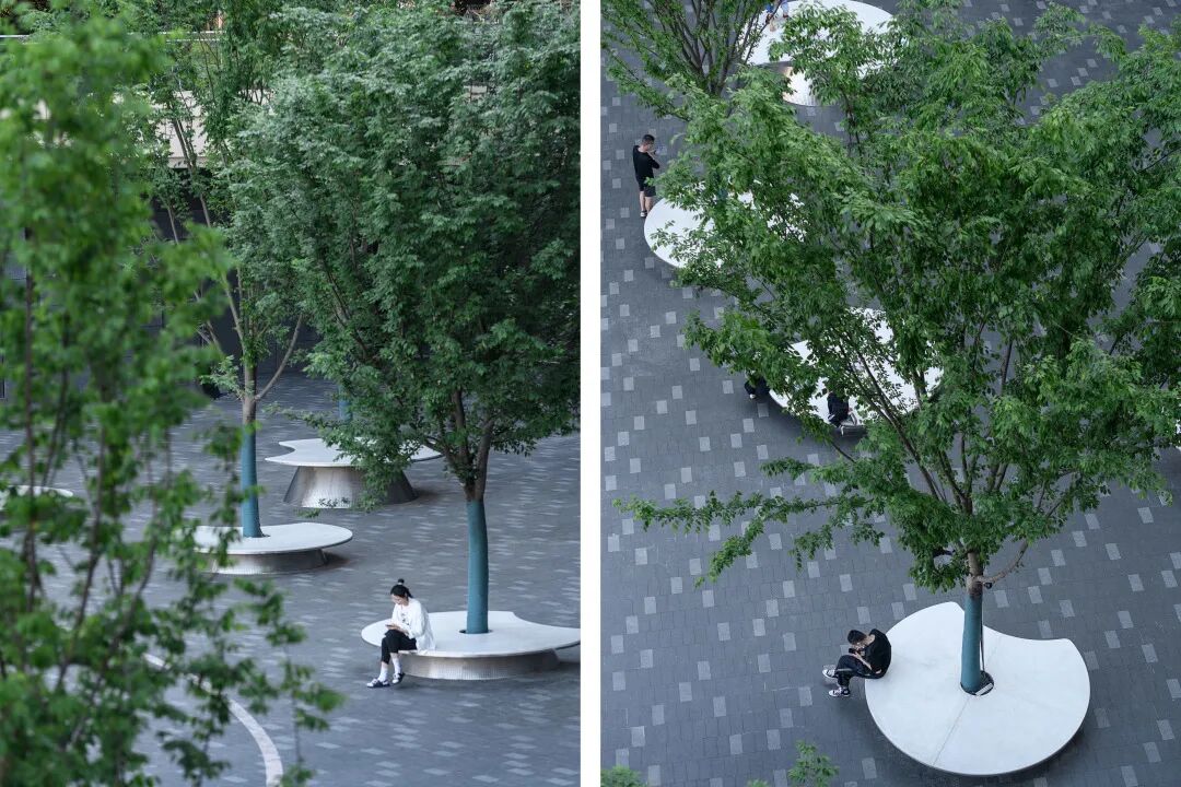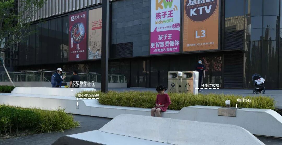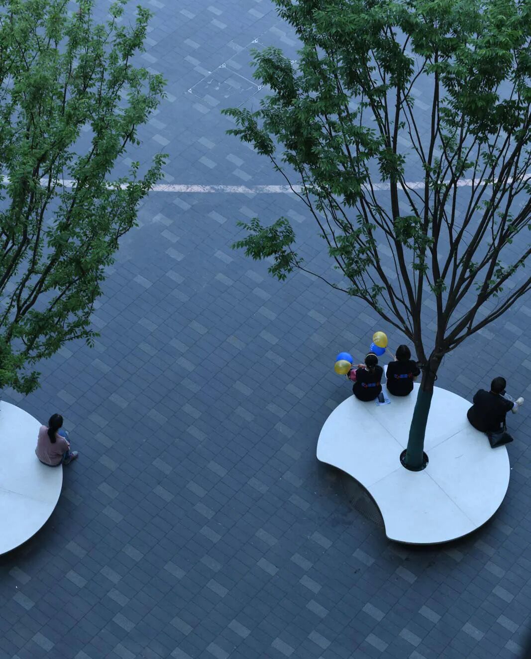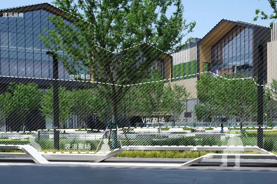 建筑规划中留下一个V型冷区空间,在视线和动线上都不易到达。我们重新规划了室外动线将这个V型空间和主动线形成联动,设计成了一处动静皆宜的多维休闲聚场,大大增加了冷区的热度。